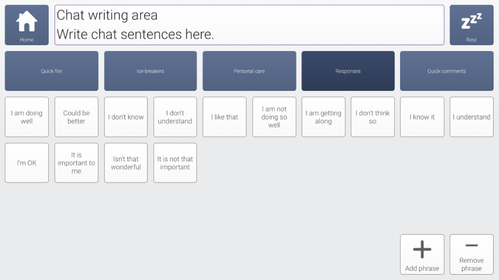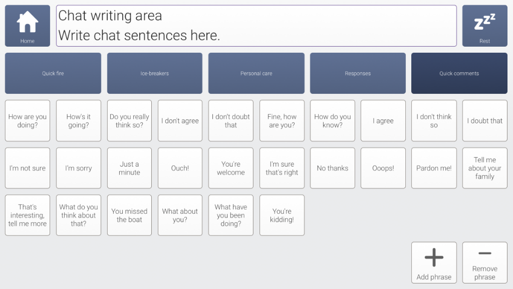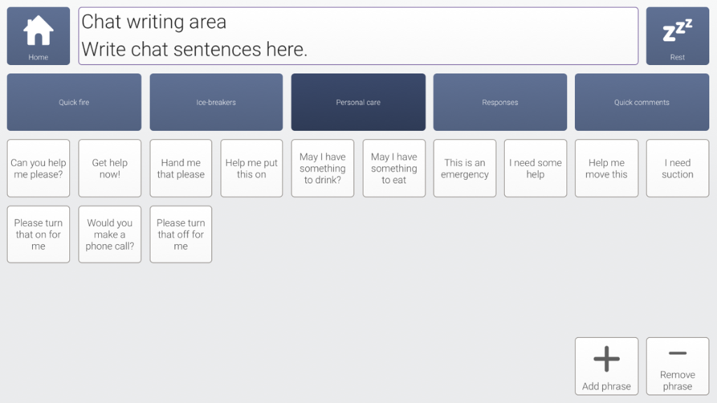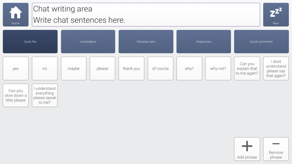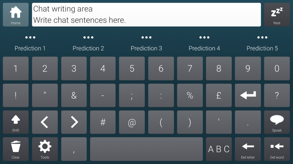 An adapted version of the Fast Talker 3 keyboard and instant messaging designed for use with a keyguard. Layout is 10x6 with oversized cells for prediction and space bar.