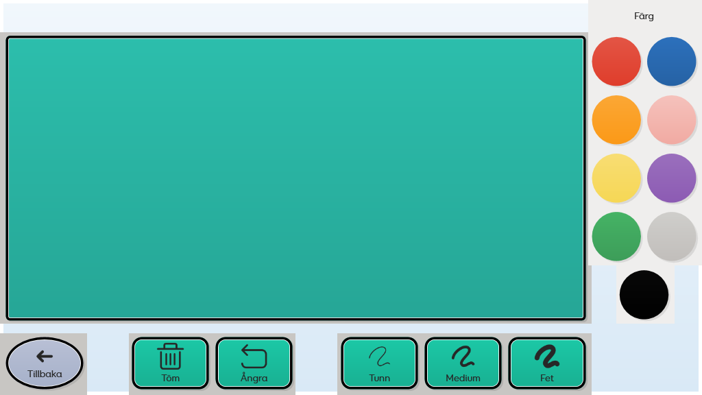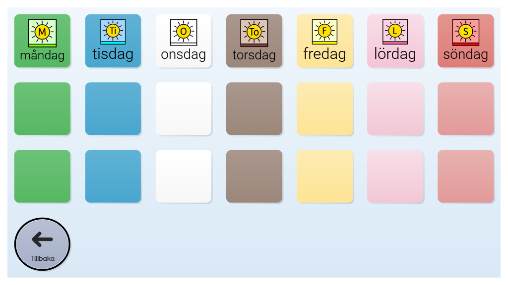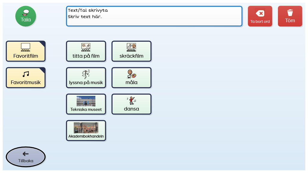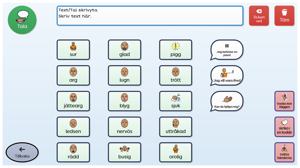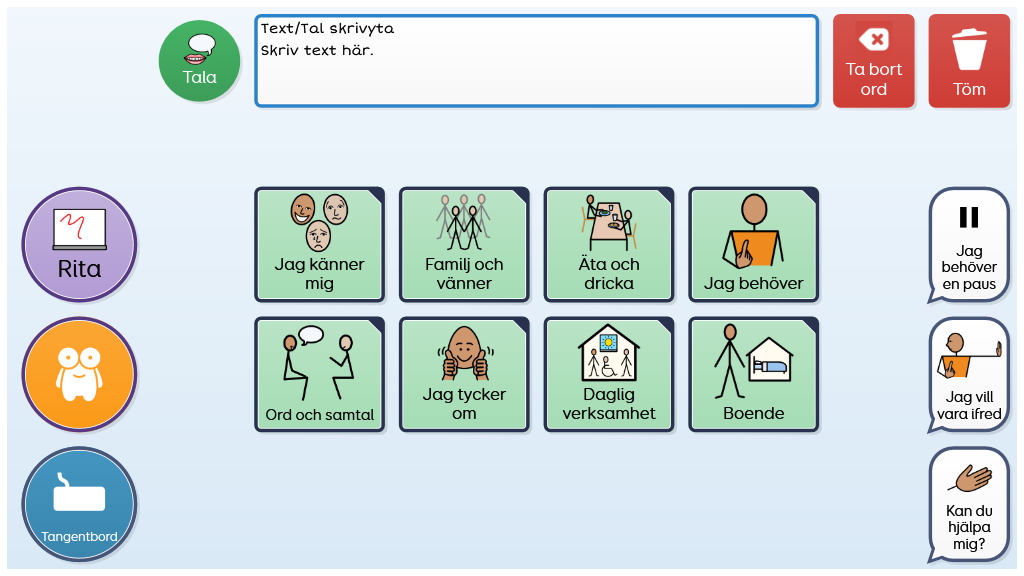 Grundläggande kommunikation från fyra kategorier; känslor, behov, äta & dricka, intressen. Integrerad whiteboardtavla, snabbfraser samt dags- och veckoschema
