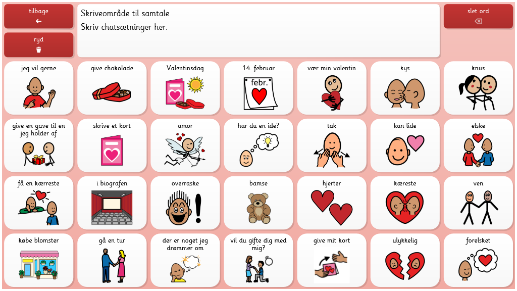 I dette sidesæt kan du lave et valentinskort. Vælg en forside, vælg en tekst eller skriv den selv ved hjælp at tastaturet, print ud og klip. Giv den til en du holder af. I sidesættet kan du også bruge de søde symojis, og snakke om valentinsdag, om hvad du gerne vil gøre sammen med eller for dem du holder af.