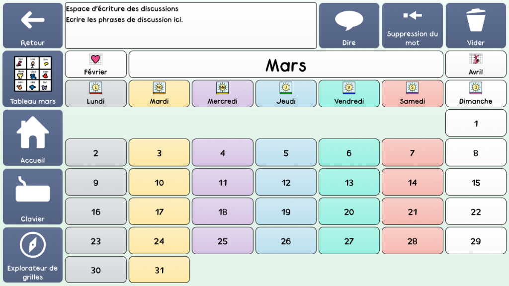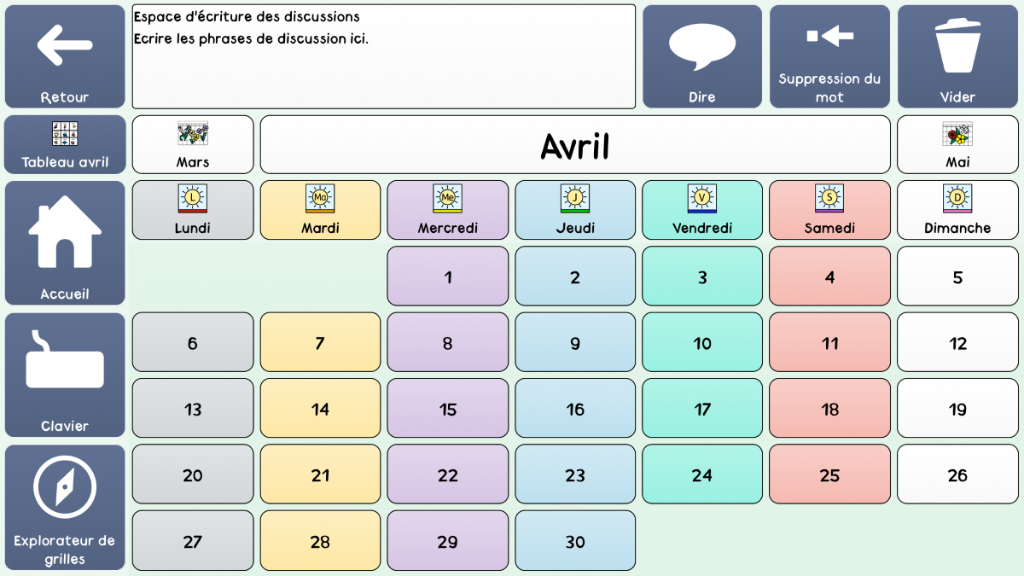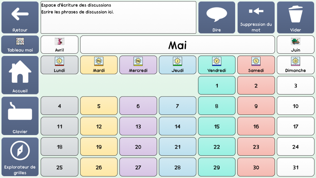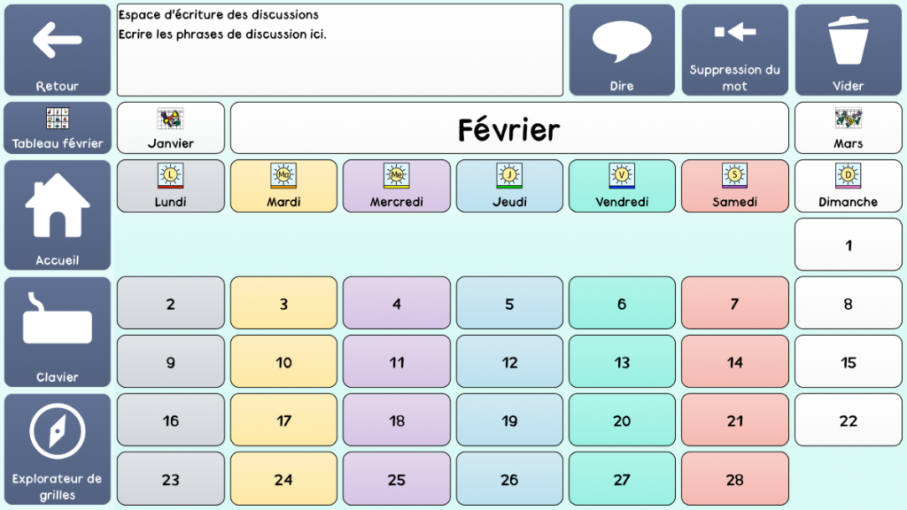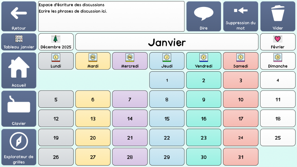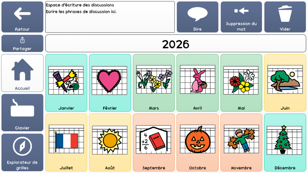Voici un ensemble de pages « Cahier de vie 2026 » issu du modèle de CAAnard et Zazou. J’ai essayé de me rapprocher de la présentation de l’ensemble de pages GRID « Super Core 50 ». Sur les pages mois vous trouverez une case (exemple : tableau janvier), qui amènera à une copie de tableaux de communication réalisés par l’association Poetic’Alix. Si vous avez des questions ou des modifications à apporter voici mon mail : pauline-nancy@live.fr
