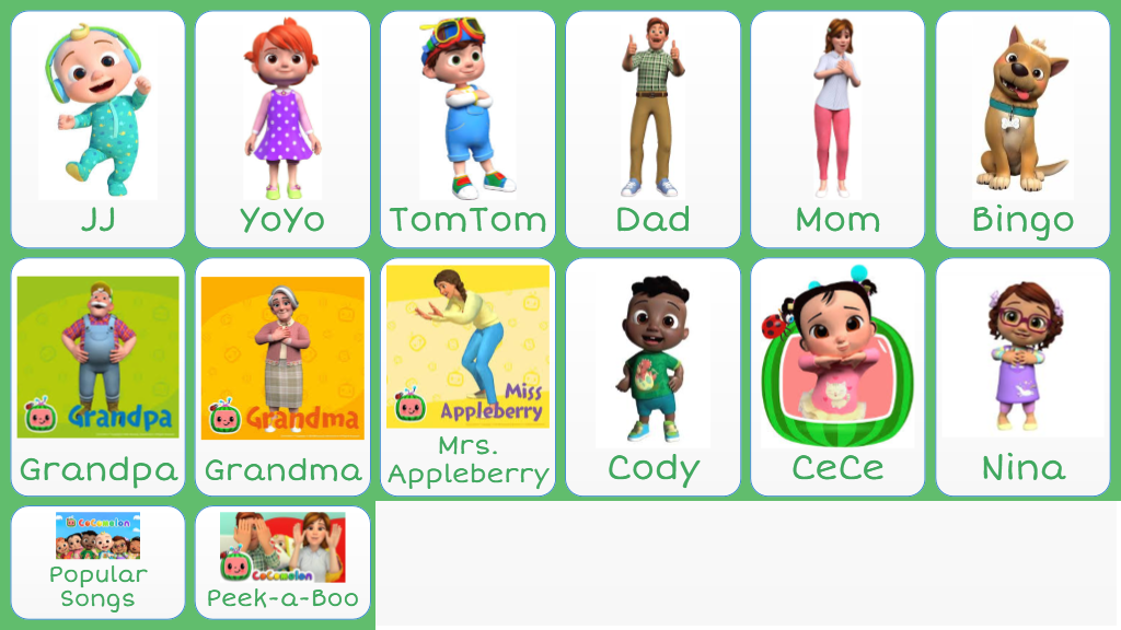 Cocomelon characters with youtube links attached Laken-Cook Medical-Demo-Columbus Rehab-Tiffany