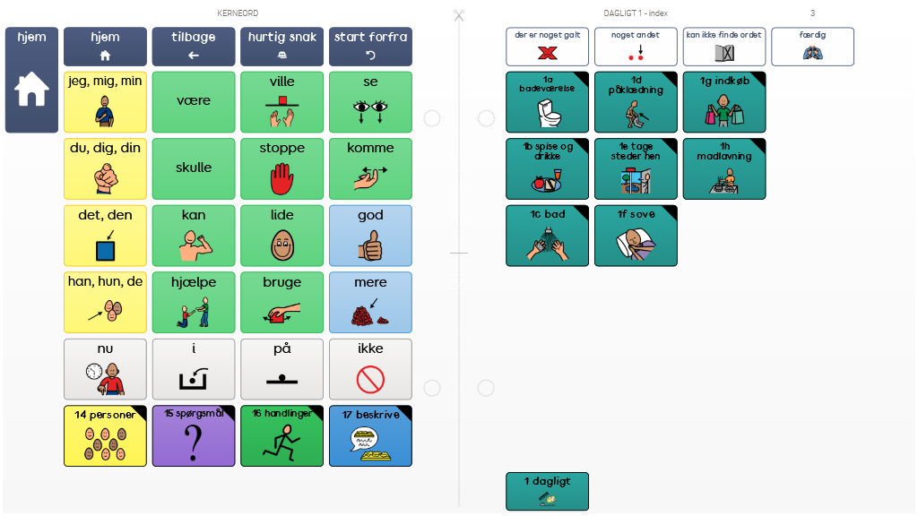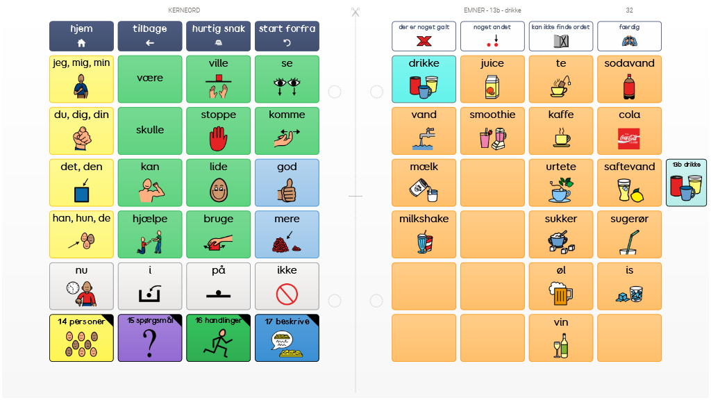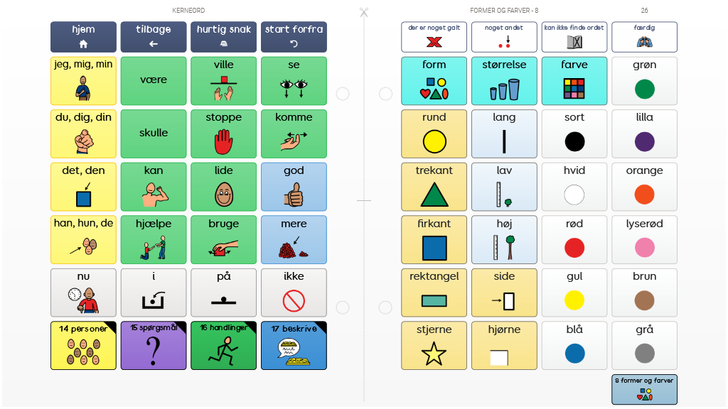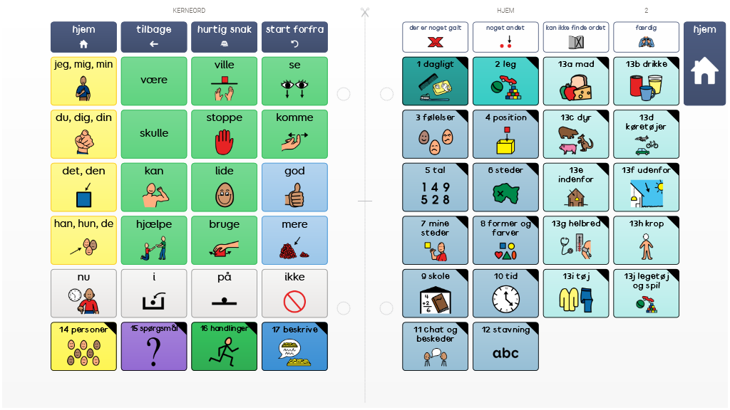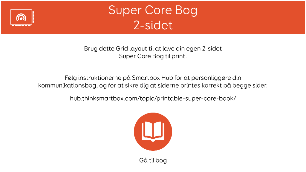 Til de af jer, som så disse bøger på ISAAC konferencen. Jeg deler dem lige her, til dem som hurtigt ønsker at komme igang. De vil mere officielt blive delt i "Print materialer" mappen meget snart. Super Core Printable Books are grid sets based on the Super Core language system, designed to be personalised within Grid software. Once printed, cut out and assembled, they form paper-based communication books which can be used anytime, anywhere. Printable books contain consistent core words, language for daily and play activities and short phrases. Find guidance on personalising and printing them on the Smartbox Hub. This grid set contains vocabulary tailored to children and forms a compact double sided book with 6x8 cells. Note: Ensure you are using Grid version 100 or above. v1.0