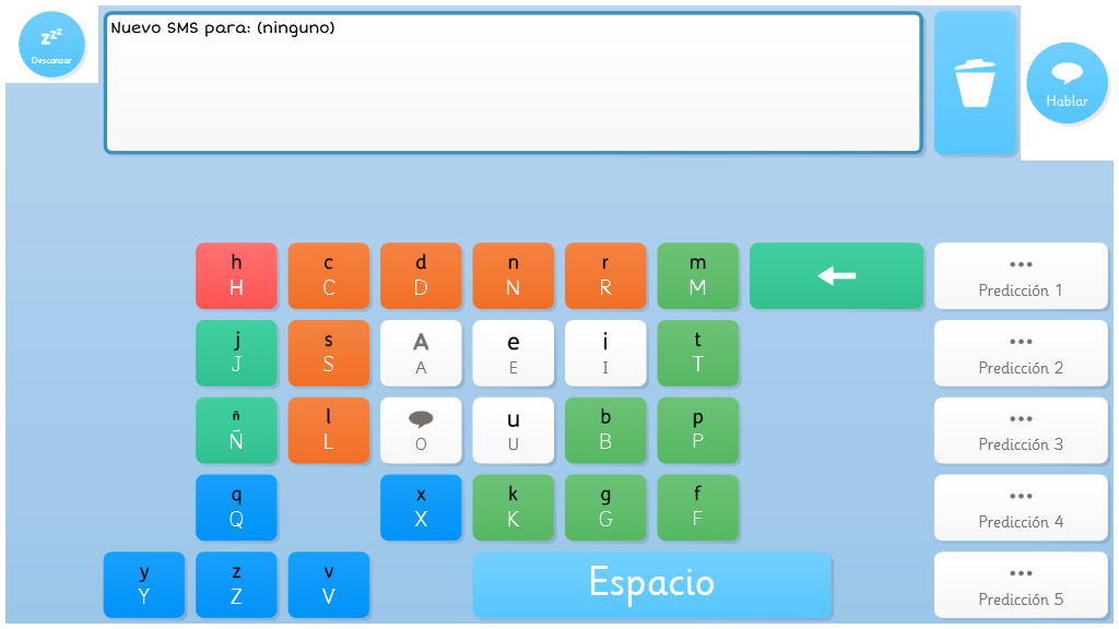Teclado sencillo con teclas de colores y celdas de predicción con símbolos.