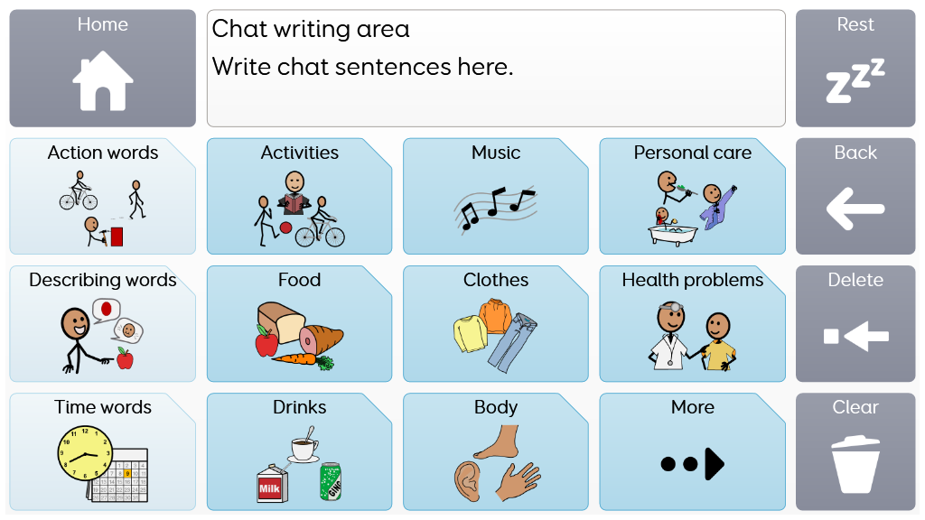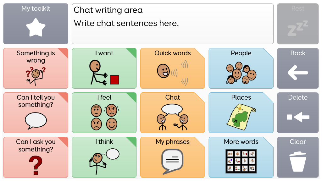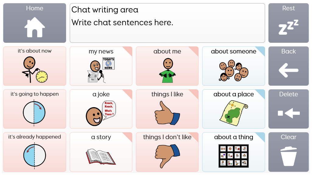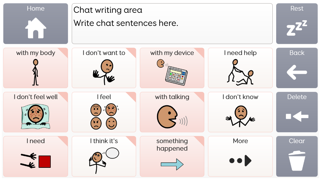 Voco Chat is a low-cell count symbol vocabulary, designed to enable users to communicate for a wide range of reasons. Message pathways, with built-in jumps and carefully selected vocabulary, provide a supported approach to language. The grid set includes resources for supporting communication and emotional wellbeing, with apps such as Symoji and Camera to support interaction and engagement. Voco Chat is suitable for anyone who needs larger cells, and can be used with touch, eye gaze, pointer and switches. Auditory prompts are included for both columns and individual cells. When you add Voco Chat for the first time, you can select either ‘Child’ or ‘Teen and Adult’ in order to choose the most appropriate vocabulary for the user. v1.05
