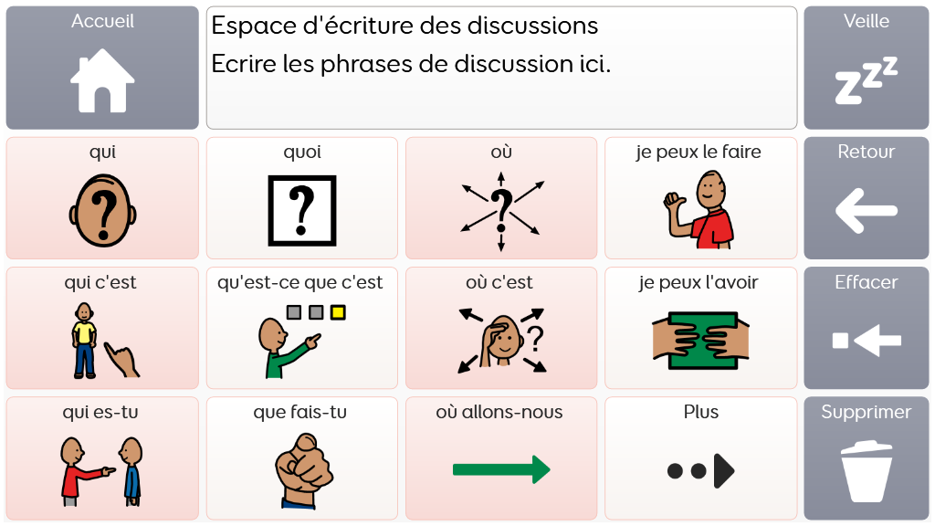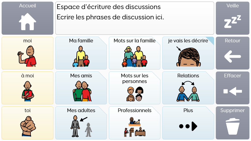 Voco Chat est un vocabulaire de symboles à faible nombre de cellules, qui permet aux utilisateurs de communiquer dans de nombreuses situations. Les voies de message (avec des sauts intégrés et un vocabulaire soigneusement sélectionné) offrent un système formel de la langue. L'ensemble de pages comprend des ressources pour soutenir la communication et le bien-être émotionnel, notamment avec des applications comme Symoji et Appareil photo pour favoriser l'interaction et l'engagement. Voco Chat convient à tous ceux qui ont besoin de cellules plus grandes, et peut être utilisé avec le toucher, la commande oculaire, le pointeur et les contacteurs. Des invites auditives sont incluses pour les colonnes et les cellules individuelles. Lorsque vous ajoutez Voco Chat pour la première fois, vous pouvez sélectionner « Enfant » ou « Ado et adulte » afin de choisir le vocabulaire le plus approprié pour l'utilisateur. v1.04