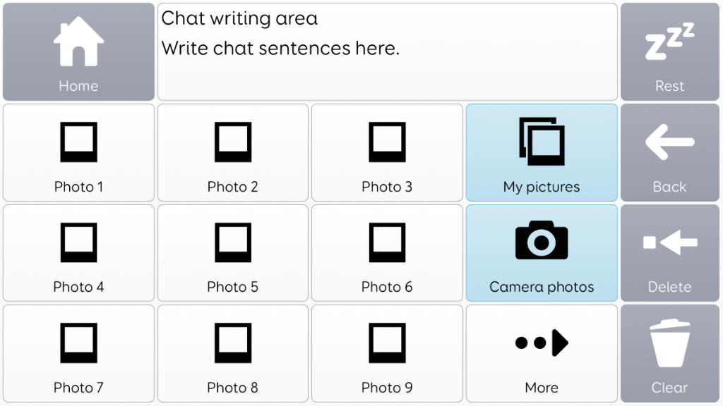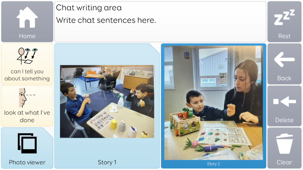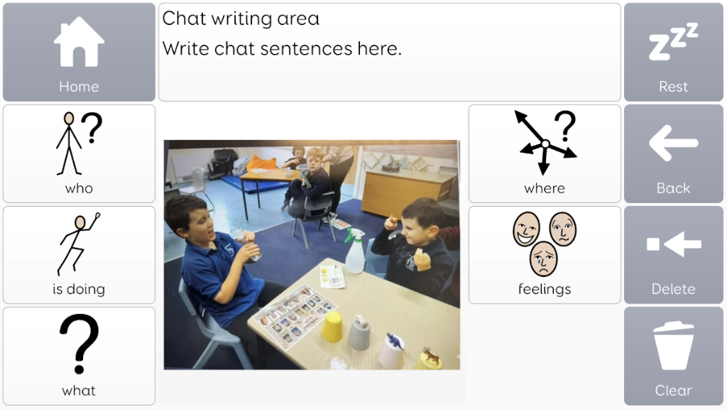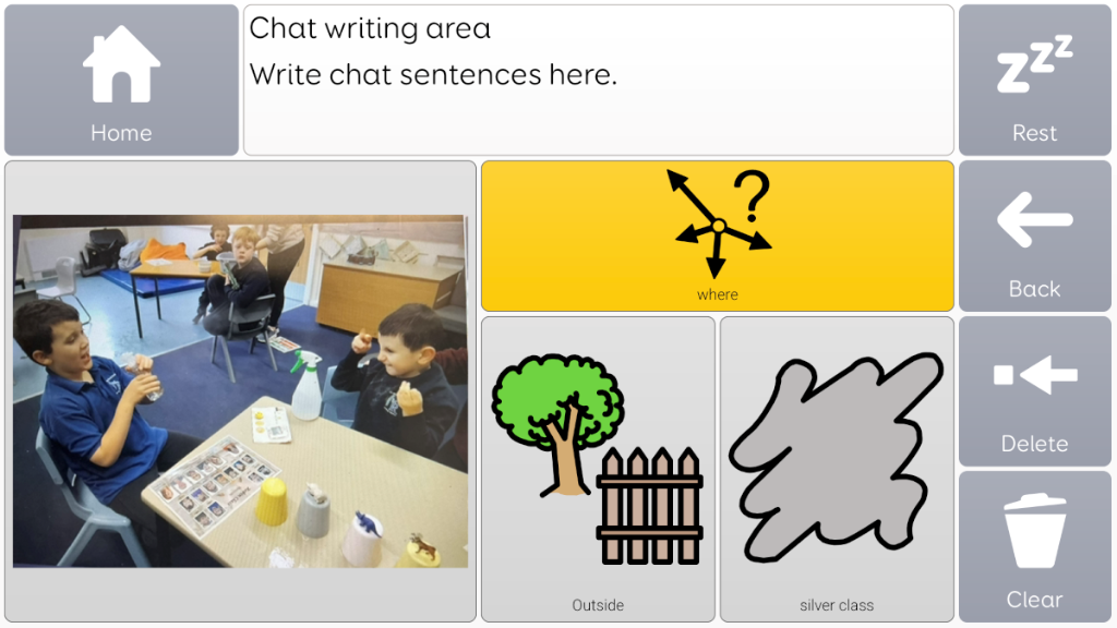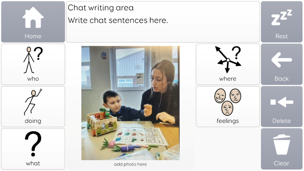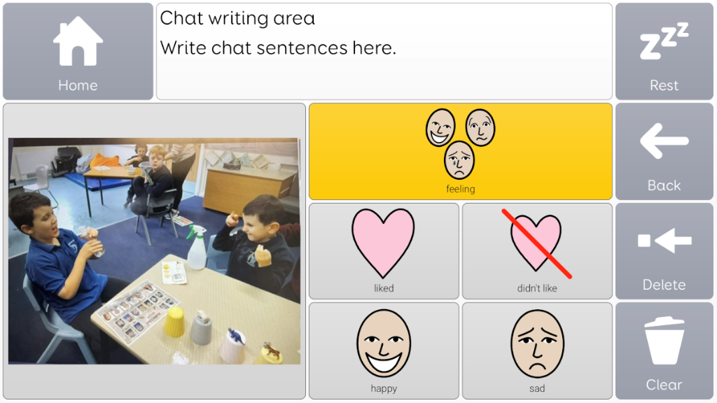 Photo album taken from Voco chat, with language prompts surrounding image. Great for sharing news and information, or as communiation supports, to use to talk about something that is going to happen.