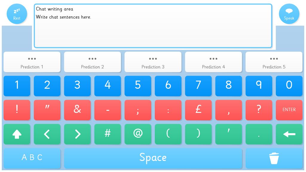 A simple keyboard with colourful keys and symbolised prediction cells.