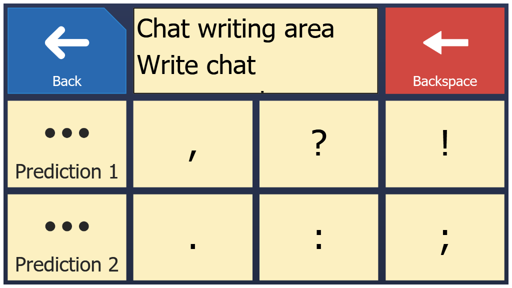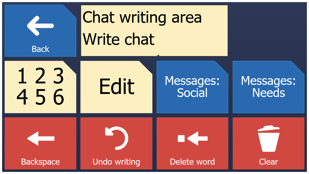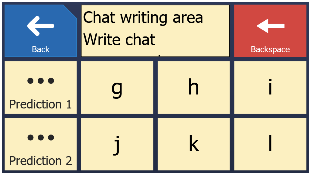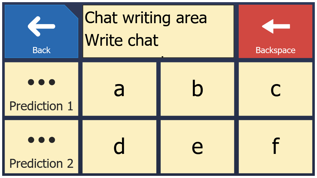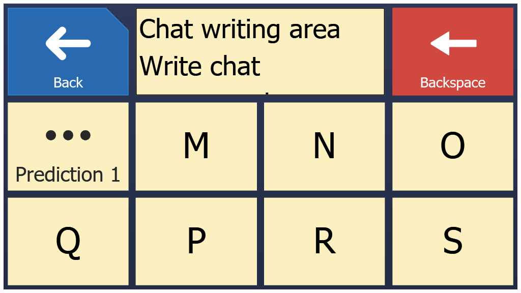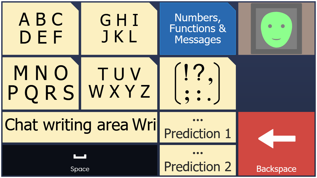 A two-hit 12 cell keyboard grid, with large targets and large font. Contains alphabet, numbers, punctuation, prediction cells and two message pages, which the user is able to add/remove messages from. Suitable for eye gaze.