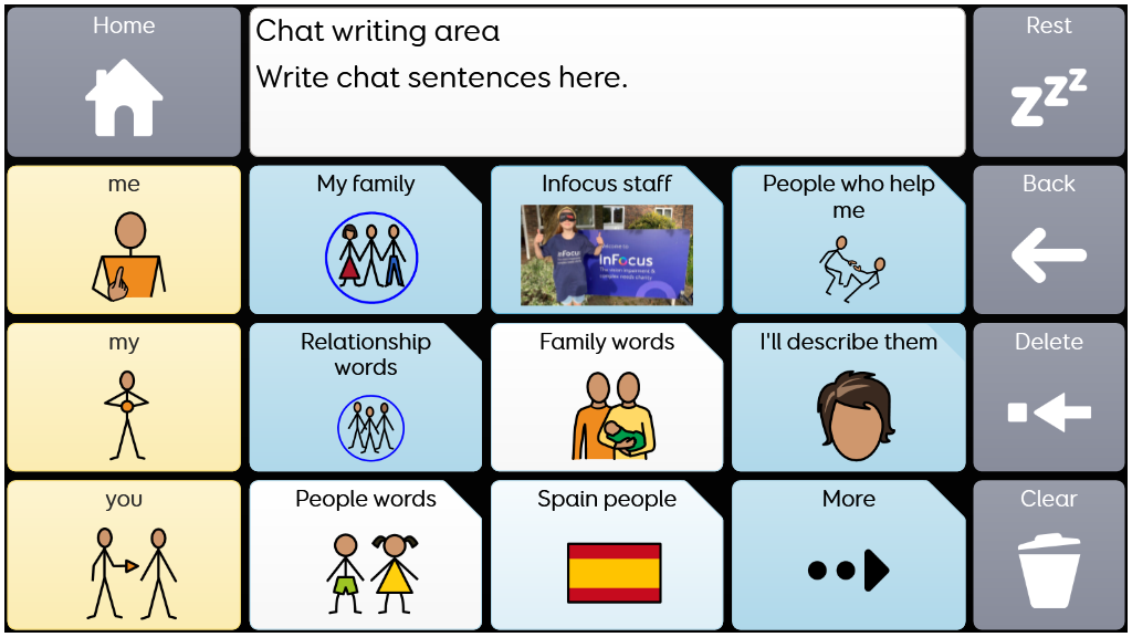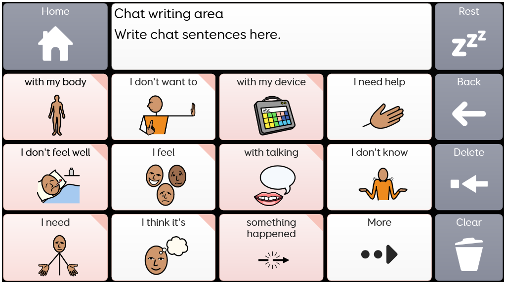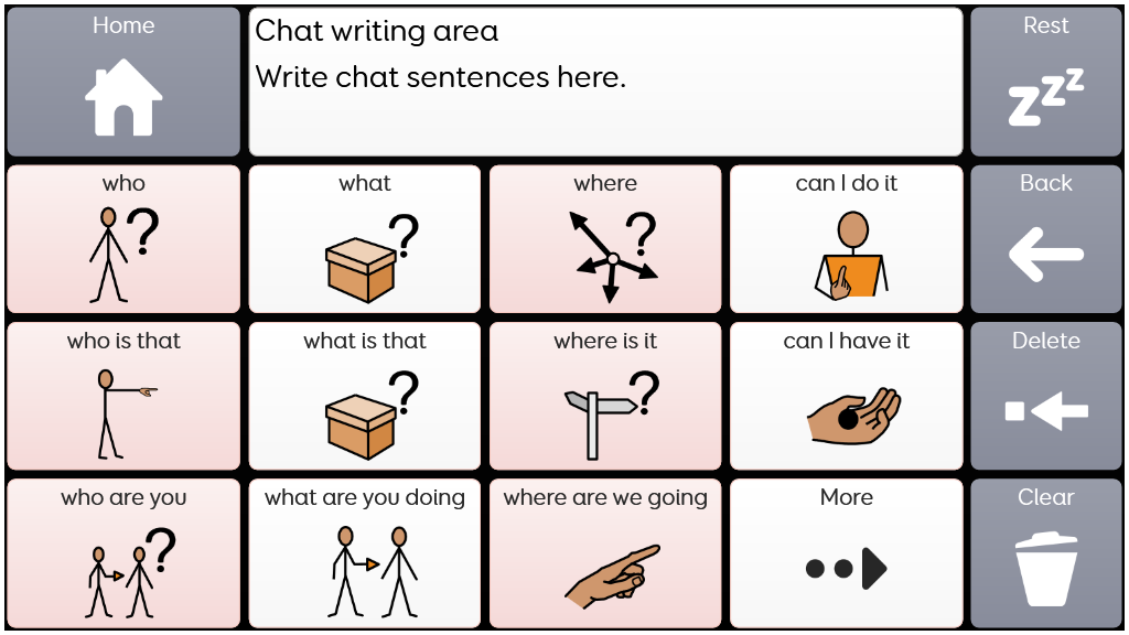 Voco Chat is suitable for anyone who needs larger cells, and can be used with touch, eye gaze, pointer and switches. Auditory prompts are included for both columns and individual cells.