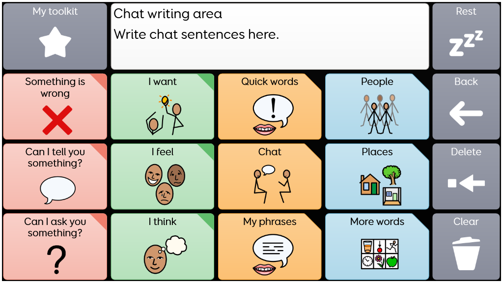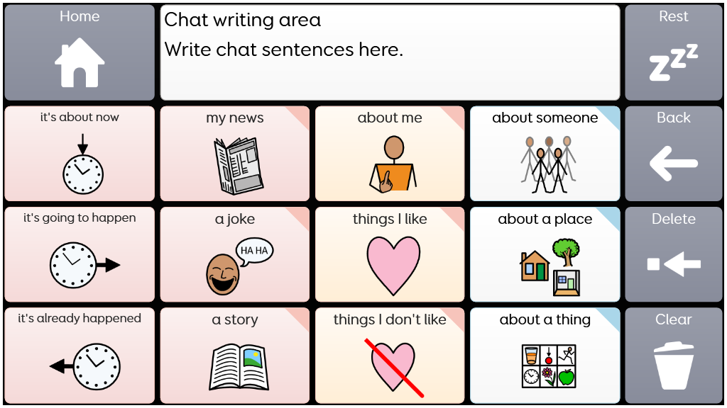 Voco Chat is a low-cell count symbol vocabulary, designed to enable users to communicate for a wide range of reasons. Message pathways, with built-in jumps and carefully selected vocabulary, provide a supported approach to language. The grid set includes resources for supporting communication and emotional wellbeing, with apps such as Symoji and Camera to support interaction and engagement.