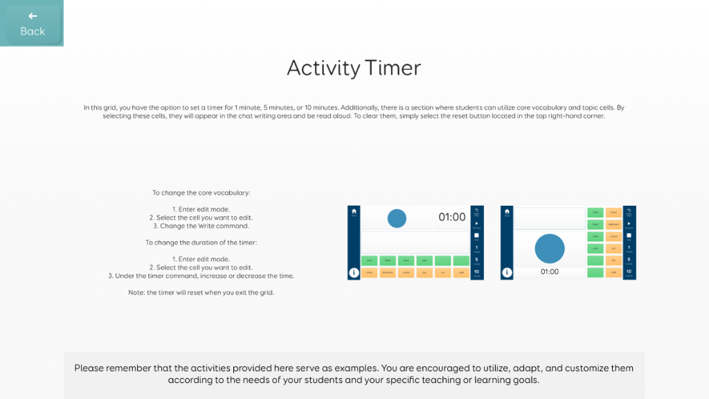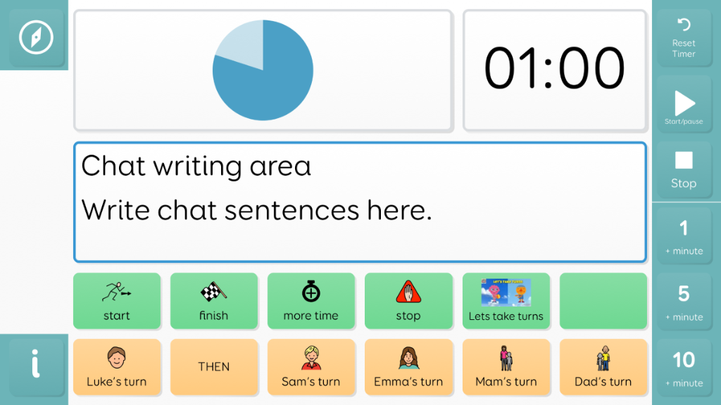 In this grid, you have the option to set a timer for 1 minute, 5 minutes, or 10 minutes. Additionally, there is a section where students can utilize core vocabulary and topic cells. By selecting these cells, they will appear in the chat writing area and be read aloud. To clear them, simply select the reset button located in the top right-hand corner. Includes audio clip of Let’s Take Turns song.