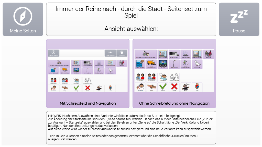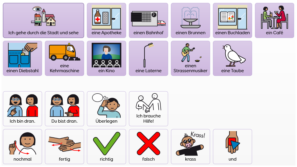 „Immer der Reihe nach – durch die Stadt“ ist ein inklusives Gedächtnis‑ und Kommunikationsspiel, bei dem Begegnungen entlang einer Stadttour Schritt für Schritt in der Reihenfolge wiederholt werden. Das Grid‑Seitenset macht das Mitspielen über eine Kommunikationshilfe mit Grid möglich. Die Seiten können bei Bedarf in Grid 3 auch ausgedruckt und als Kommunikationstafel genutzt werden. Das Spiel ist erhältlich beim Autismusverlag: https://autismusverlag.ch/immer-der-reihe-nach-durch-die-stadt/SW10322.2