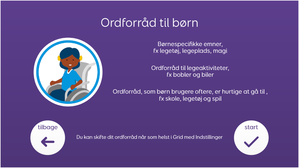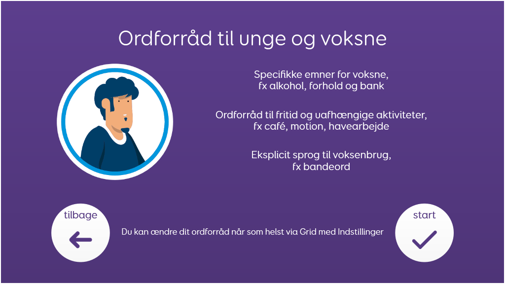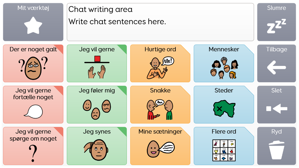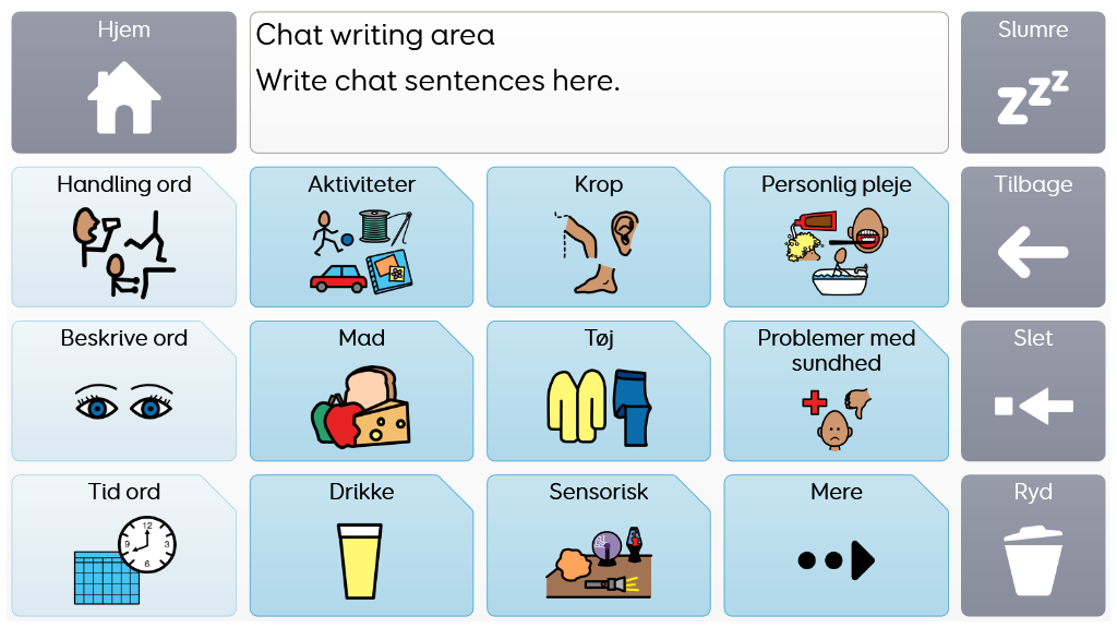 Voco Chat er et symbol ordforråd med få celler på hver side, designet til at muliggøre en bedre kommunikation til ASK-brugerne i mange forskellige henseender. System til opbyggelse af sætninger, med indbyggede genveje og nøje udvalgte ordforråd, understøtter en god kommunikation. Grid layoutet indeholder apps såsom Symoji og Kamera, til at understøtte kommunikationen, den følelsesmæssige tilstand, interaktion og engagement. Voco Chat er velegnet for de brugere som har behov for større celler, og kan betjenes ved hjælp af tryk, øjenstyring, hovedmus og 0-1 kontakter. Auditiv scanning er inkluderet for både kolonner og de individuelle celler. Når du henter Voco Chat for første gang, skal du vælge mellem "Barn" eller "Ung eller Voksen", for at få det mest passende ordforråd for brugeren. v1.05