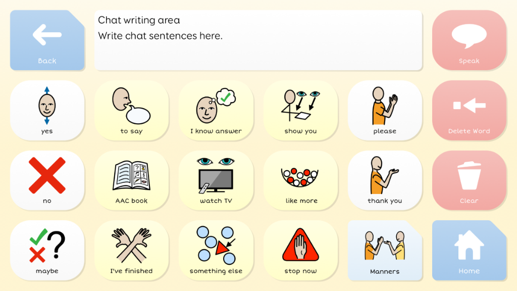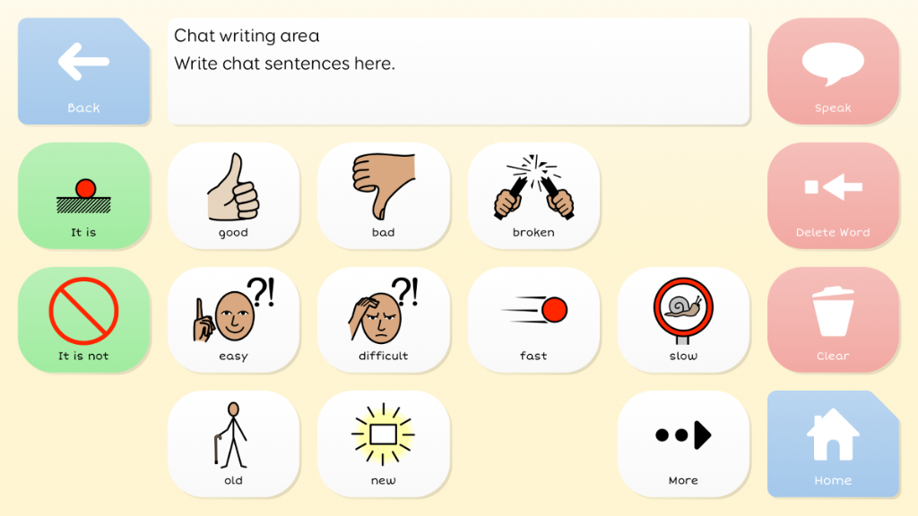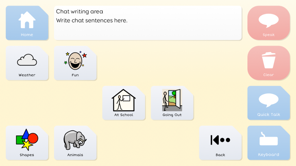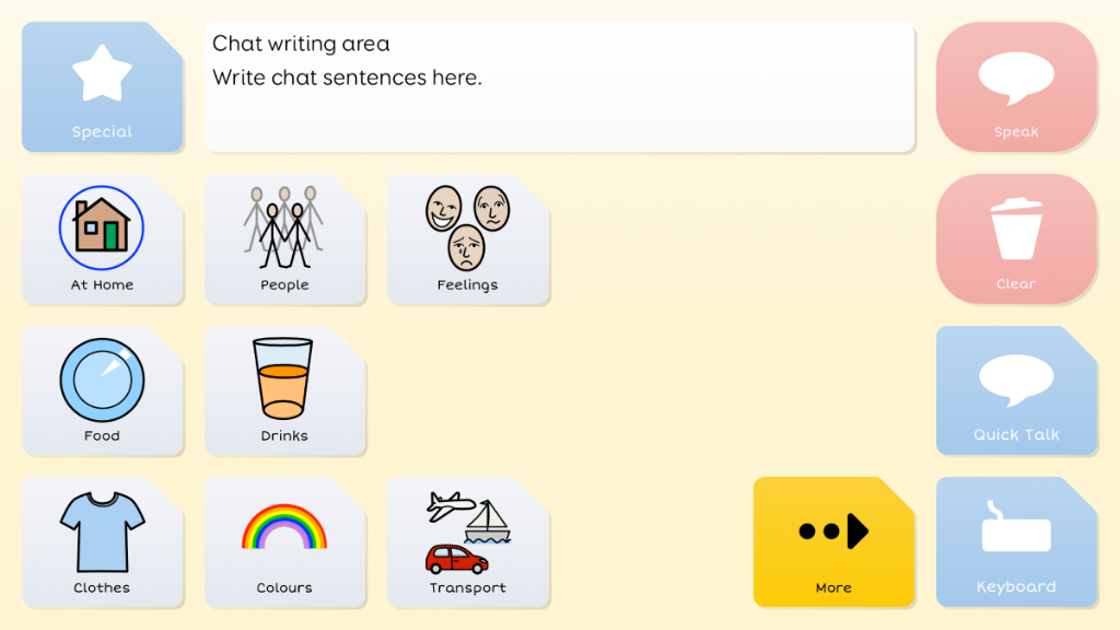 A topic based vocabulary for beginning AAC users. On each topic grid, users can build simple sentences from one or two selections, using sentence starters and topic words. Grid size is 6x3
