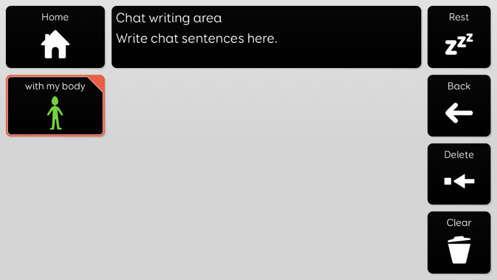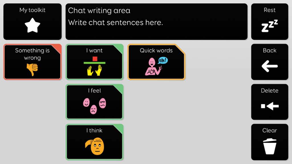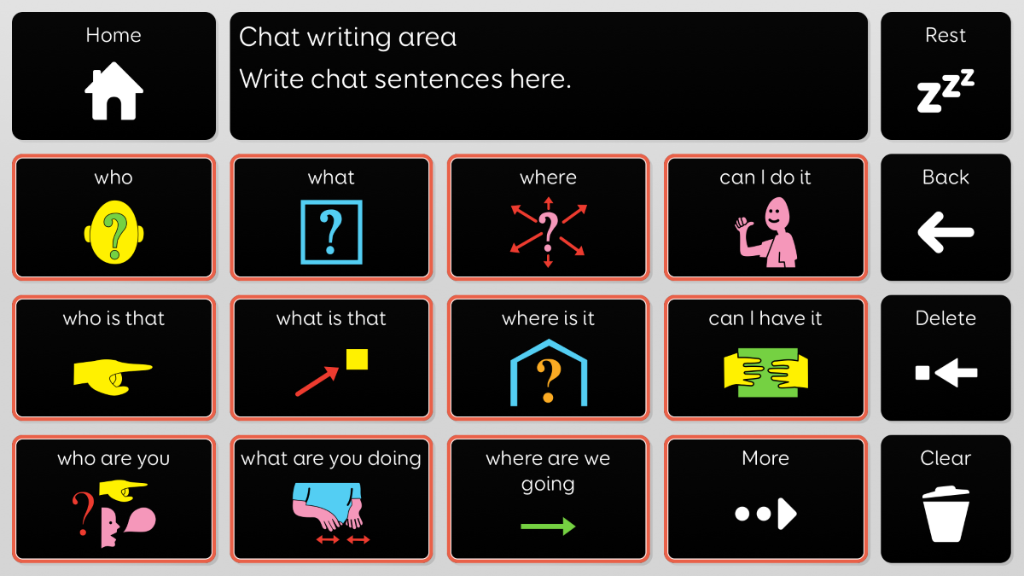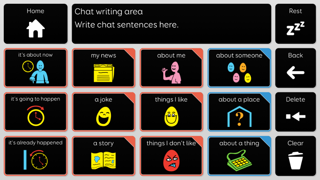 Voco Chat is a low-cell count symbol vocabulary, designed to enable users to communicate for a wide range of reasons. Message pathways, with built-in jumps and carefully selected vocabulary, provide a supported approach to language. The grid set includes resources for supporting communication and emotional wellbeing, with apps such as Symoji and Camera to support interaction and engagement. Voco Chat is suitable for anyone who needs larger cells, and can be used with touch, eye gaze, pointer and switches. Auditory prompts are included for both columns and individual cells. When you add Voco Chat for the first time, you can select either ‘Child’ or ‘Teen and Adult’ in order to choose the most appropriate vocabulary for the user. PCS High Contrast symbols for the majority of the vocabulary. These symbols were designed to be easier to see for individuals with Cortical Visual Impairment. The grid set also uses a high contrast cell styling.