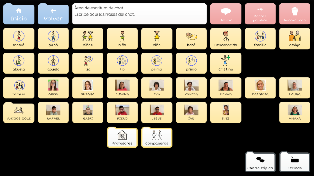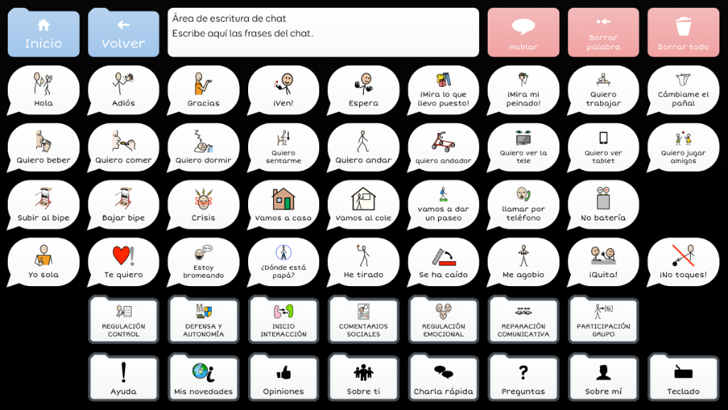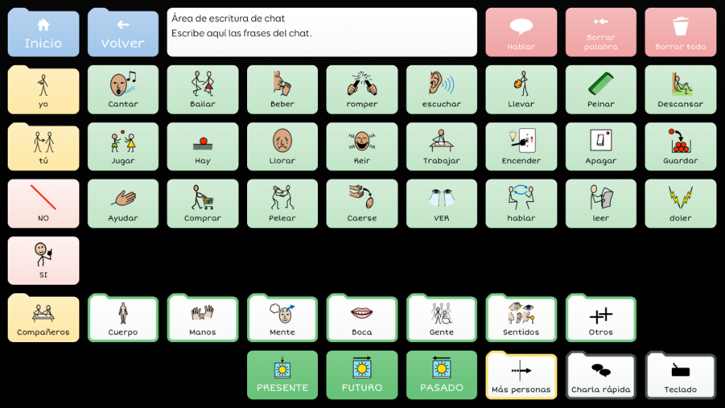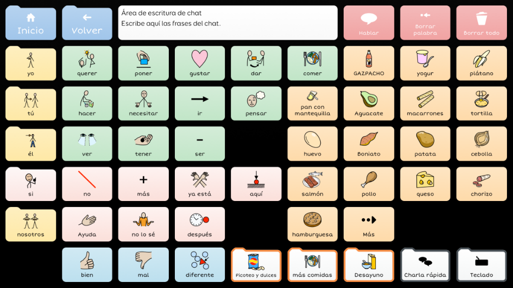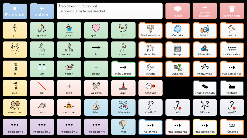 Symbol Talker G divide la pantalla en dos partes: una destinada al vocabulario núcleo y otra al vocabulario periférico. Esto significa que puedes generar frases nuevas de manera rápida y adaptada al contexto. Las herramientas de gramática inteligente de Grid 3 te ayudarán a generar frases gramaticalmente correctas con pocas selecciones. Este gridset es una evolución de BJ Adaptaciones sobre Symbol Talker D y Symbol Talker Núcleo