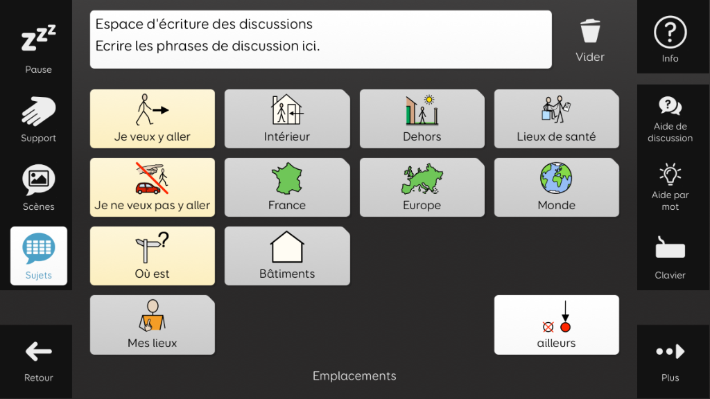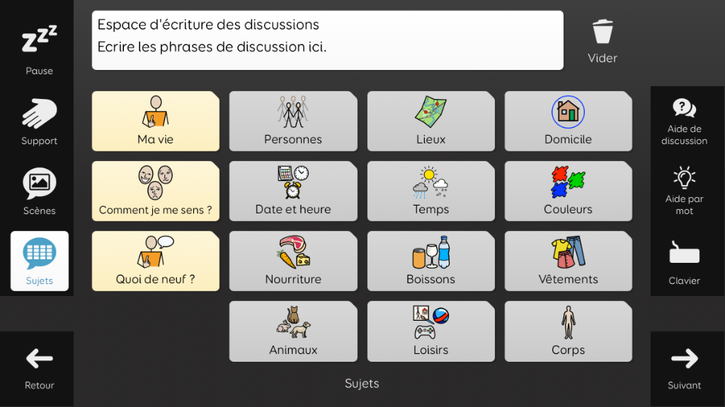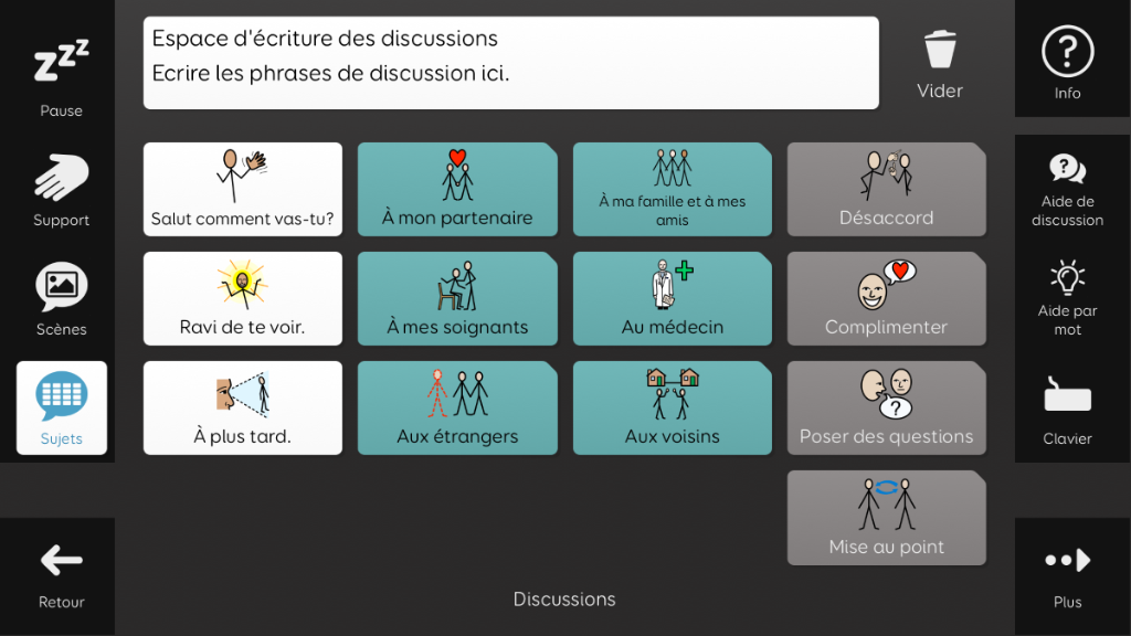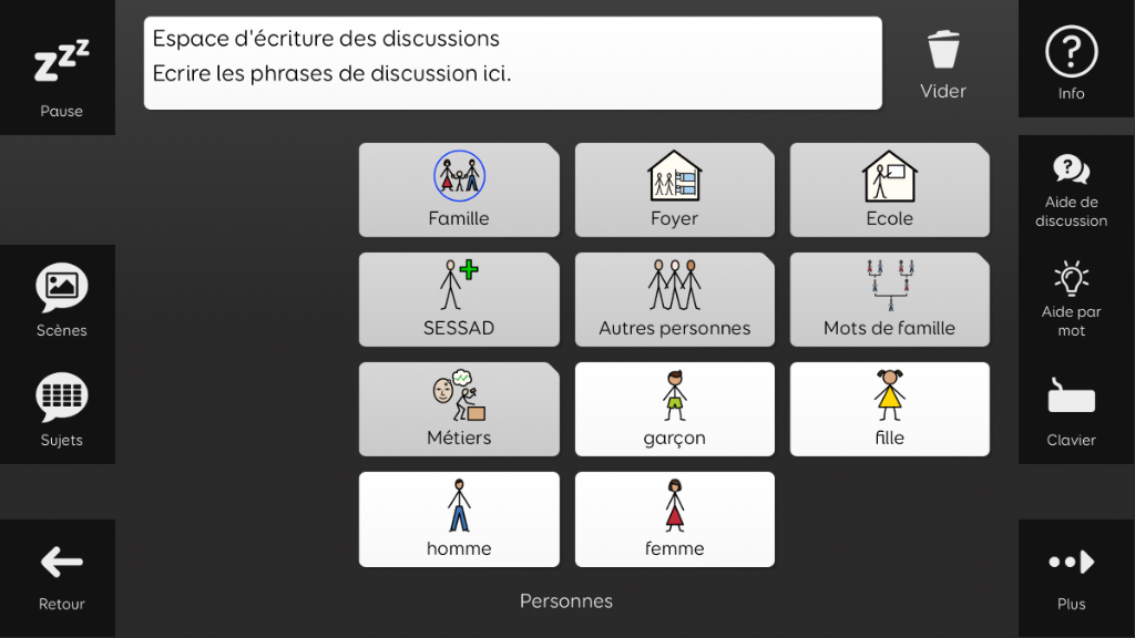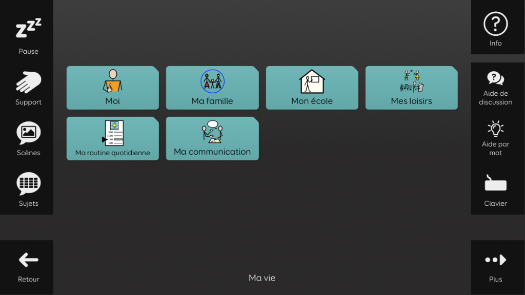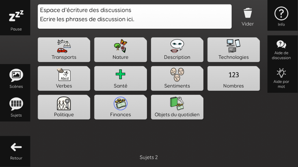 Aphasia Duo a été conçu pour les adultes atteints d’aphasie, qui pourraient bénéficier d’un vocabulaire basé sur des symboles. Son objectif est de permettre aux personnes aphasiques de communiquer dans un large éventail de situations, à l’aide de différents supports de communication. Aphasia Duo 16 convient particulièrement aux personnes présentant des troubles du langage, cognitifs, visuels ou physiques modérés, ou à celles dont la principale difficulté est l’accès au mot. Il intègre des outils facilitant l’expression, tels que des dictionnaires illustrés et une banque de mots. Aphasia Duo est compatible avec les guides-doigts et peut être utilisé avec tout mode d’accès. v1.2 Nécessite la version 94 de Grid ou supérieure.