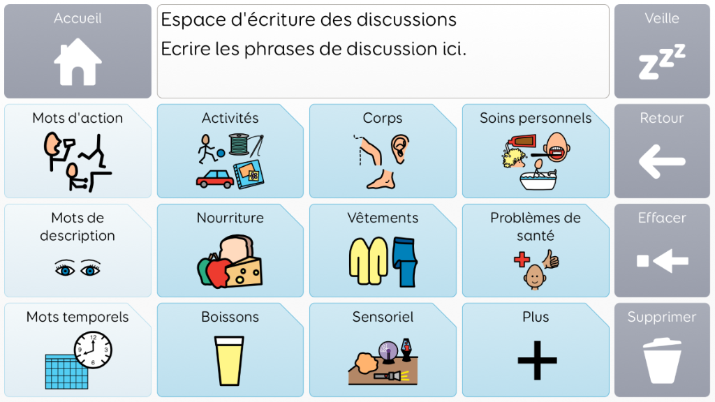 Voco Chat est un vocabulaire de symboles à faible nombre de cellules, qui permet aux utilisateurs de communiquer dans de nombreuses situations. Les voies de message (avec des sauts intégrés et un vocabulaire soigneusement sélectionné) offrent un système formel de la langue. L'ensemble de pages comprend des ressources pour soutenir la communication et le bien-être émotionnel, notamment avec des applications comme Symoji et Appareil photo pour favoriser l'interaction et l'engagement. Voco Chat convient à tous ceux qui ont besoin de cellules plus grandes, et peut être utilisé avec le toucher, la commande oculaire, le pointeur et les contacteurs. Des invites auditives sont incluses pour les colonnes et les cellules individuelles. Lorsque vous ajoutez Voco Chat pour la première fois, vous pouvez sélectionner « Enfant » ou « Ado et adulte » afin de choisir le vocabulaire le plus approprié pour l'utilisateur. v1.04
