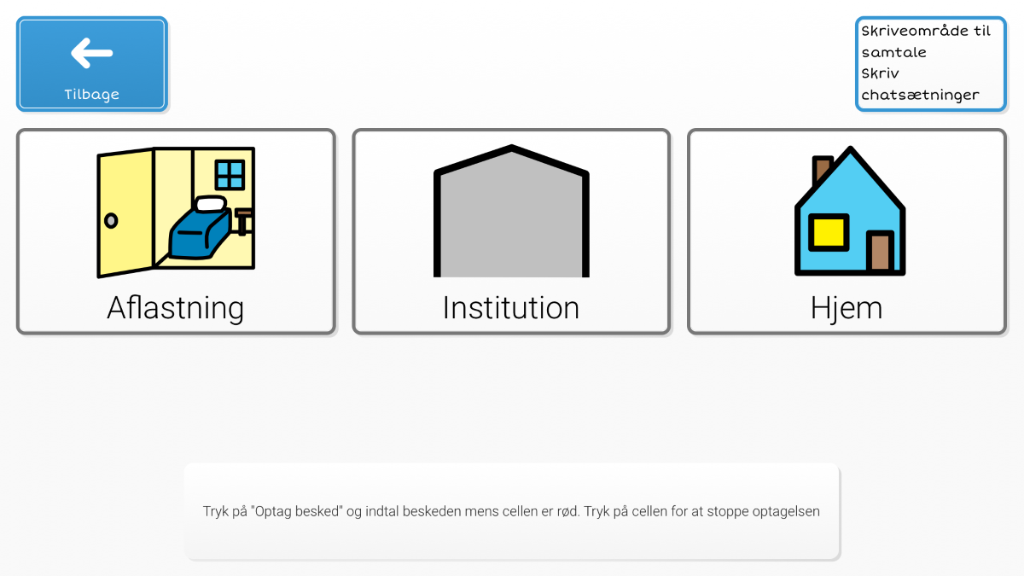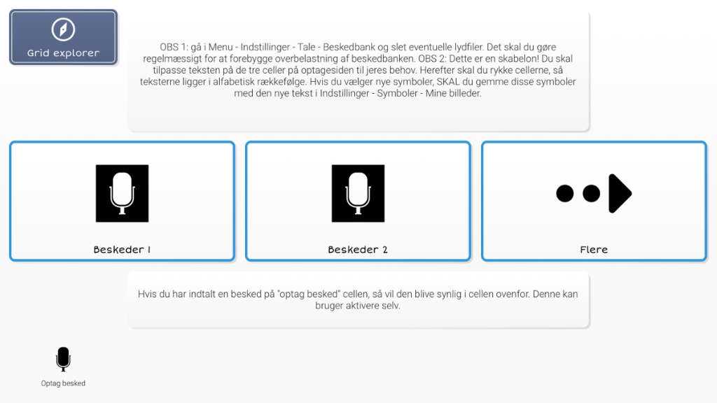 Et diktafon-/nyhedssidesæt med tre optage-felter. Hjælper indtaler dagens besked i jeg-form, sådan, at det bliver brugers besked. Bruger aktiverer efterfølgende selv beskeden. En ny indtalelse er lige med en ny besked.