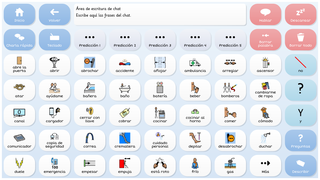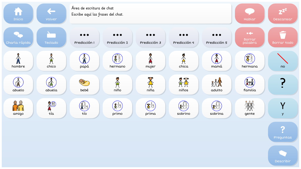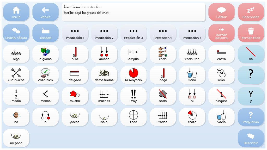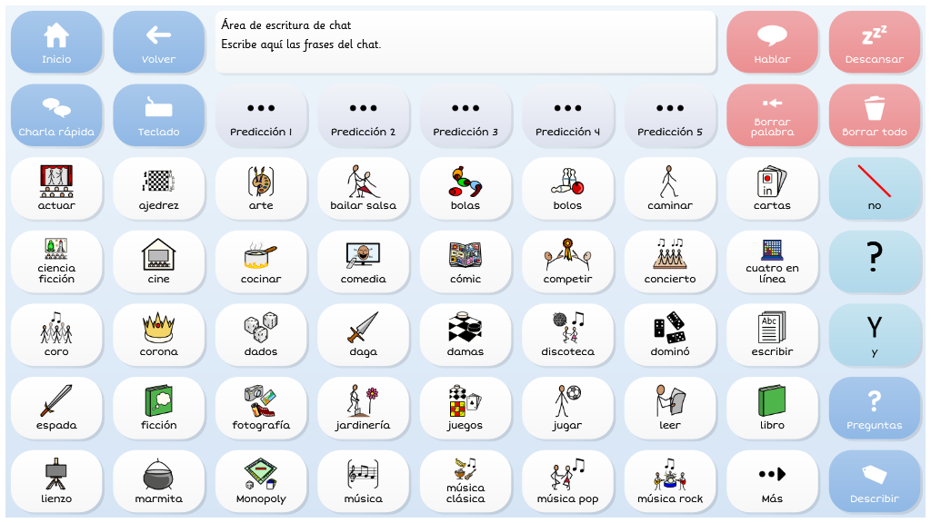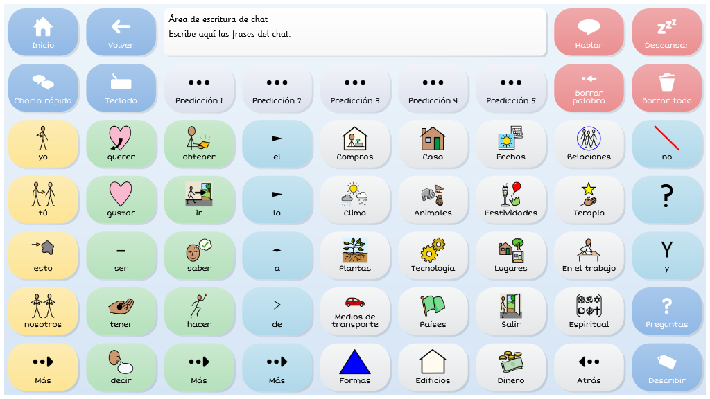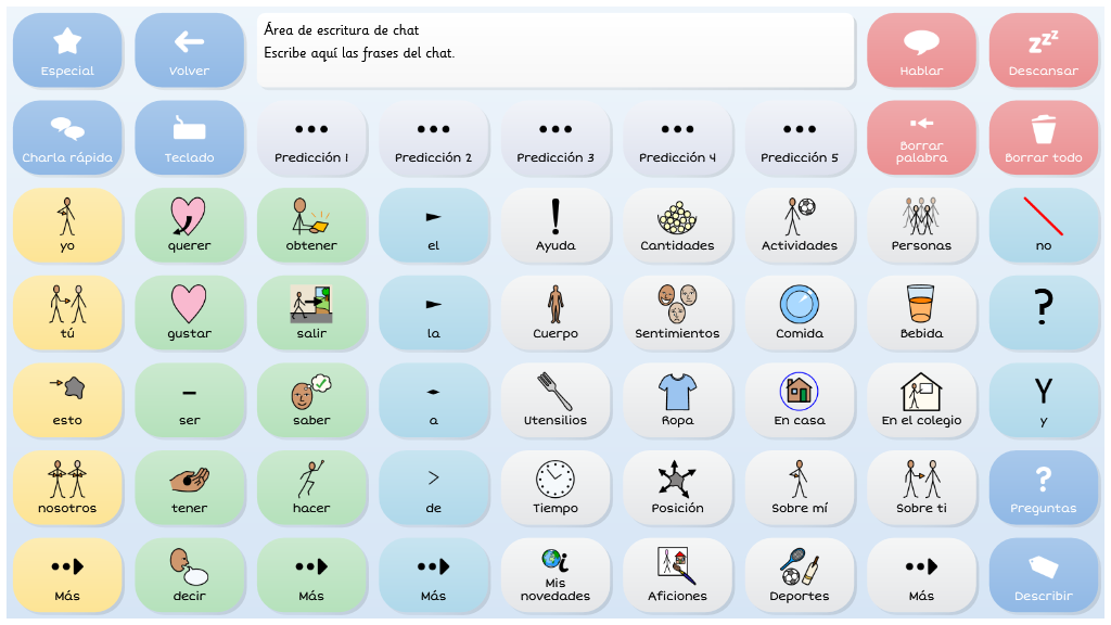 Symbol Talker D contiene el vocabulario núcleo en la página de inicio. Esto significa que puedes generar frases nuevas de manera rápida y acceder a las cuadrículas temáticas solo para encontrar palabras menos comunes. Las herramientas de gramática inteligente de Grid 3 te ayudarán a generar frases gramaticalmente correctas con pocas selecciones.