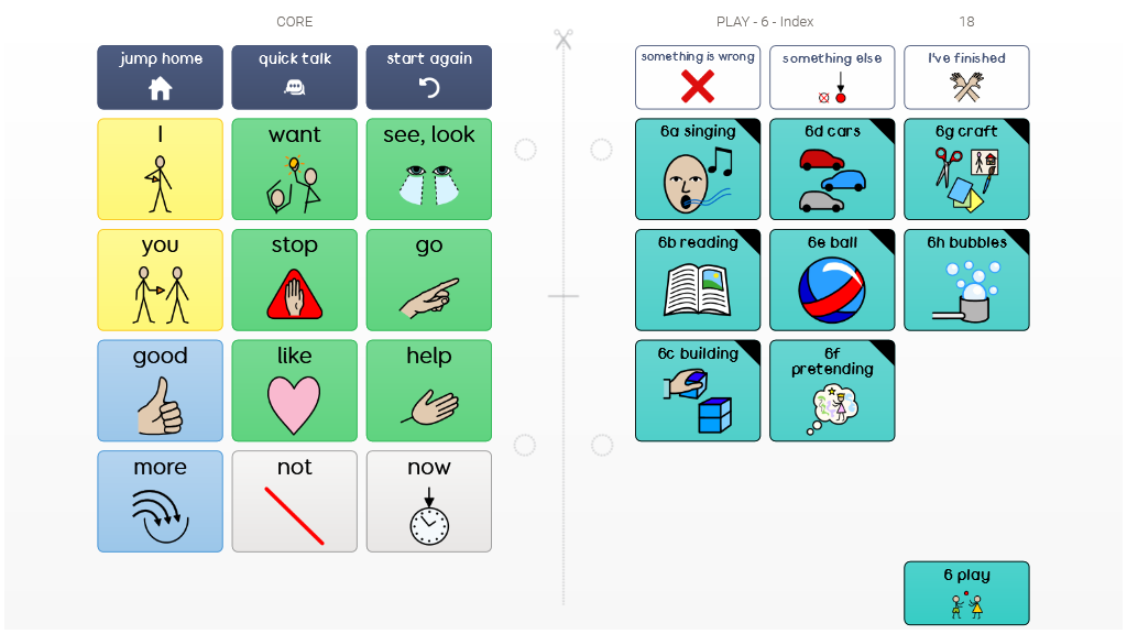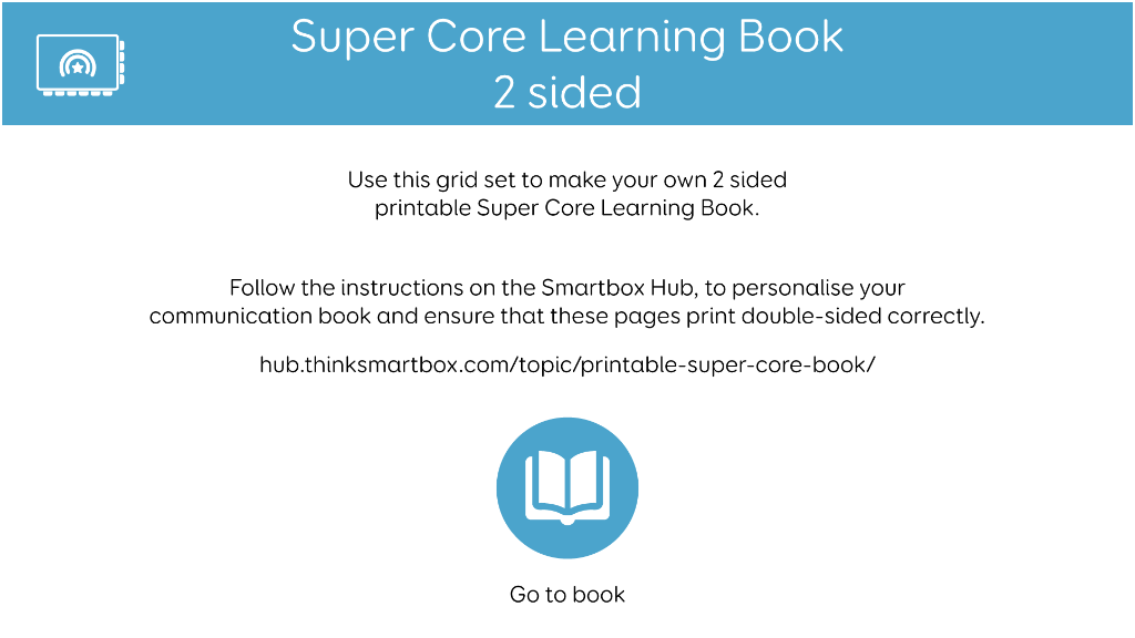 Super Core Printable Books are grid sets based on the Super Core language system, designed to be personalised within Grid software. Once printed, cut out and assembled, they form paper-based communication books which can be used anytime, anywhere. Printable books contain consistent core words, language for daily and play activities and short phrases. Find guidance on personalising and printing them on the Smartbox Hub. This grid set contains vocabulary tailored to children and forms a compact double sided book with 4x6 cells. Note: Ensure you are using Grid version 93 for the latest print settings v 1.0