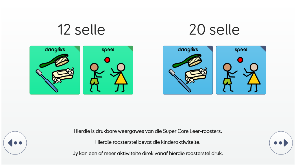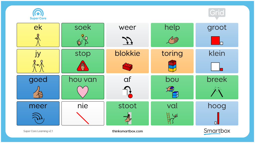 Die Super Core Leer roosters bied ‘n geleidelike aanloop na die volle Super Core simbool woordeskat en geleentheid om selfvertroue op te bou met simbool AAK. Hulle sluit al die daaglikse en speel aktiwiteite woordeskat in van Super Core, vergesel deur ‘n vereenvoudigde kernwoordeskat met ‘n laer sel aantal van 12 of 20 selle. v2.1