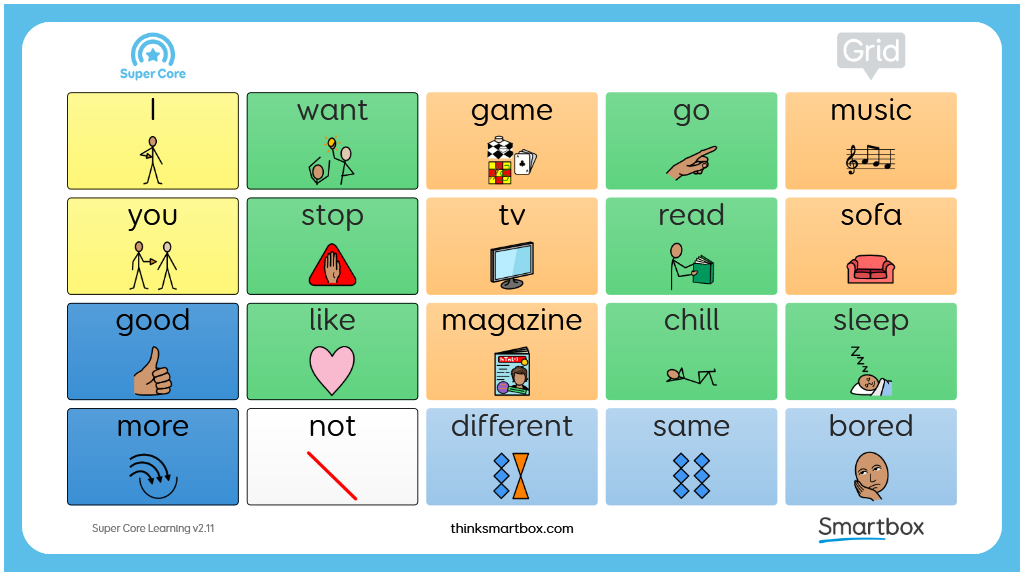 The Super Core Learning grids offer a gentle progression to the full Super Core symbol vocabulary, and an opportunity to build confidence with symbol AAC. They include all of the daily and play activity vocabulary from Super Core, alongside a simplified core vocabulary with a lower cell count of 12 and 20 cells. v2.11