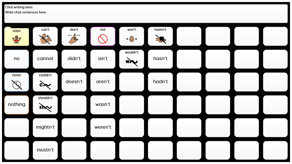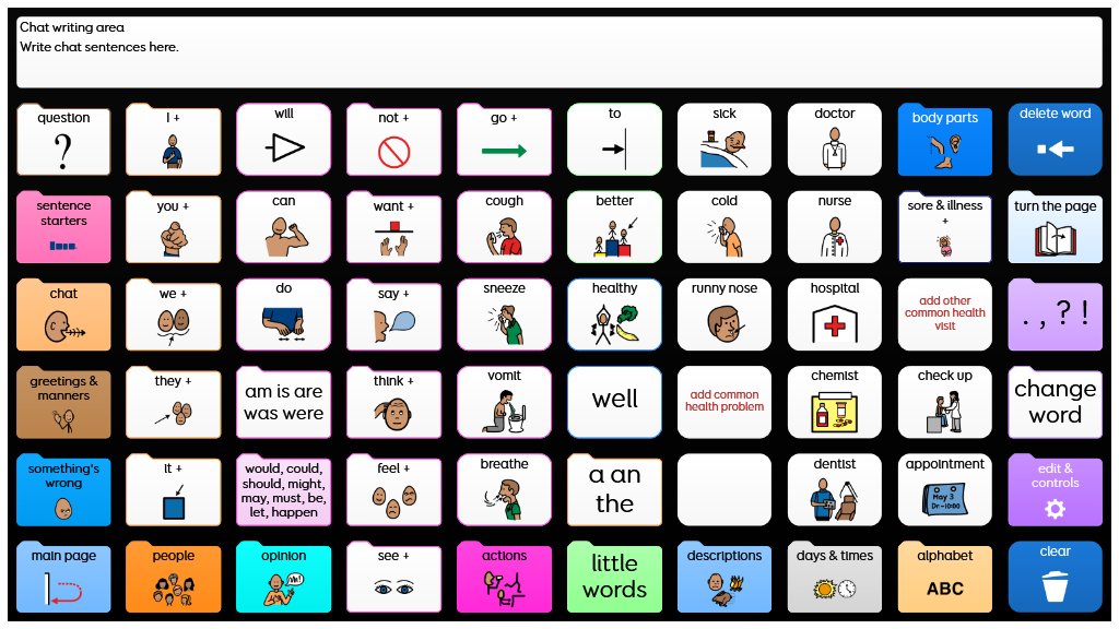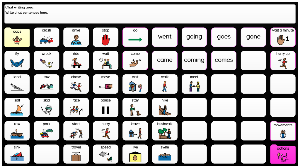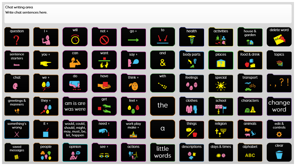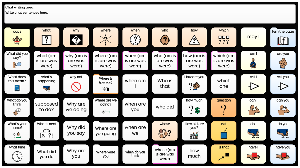 Designed to support more grammatically complex language, using sentence starters, core words, and morphology. Whole words and symbols are used in this grid set, alongside spelling and word prediction to support literacy. When any verb is selected a self-closing grid appears so the individual can select the verb form they require. This is the critical difference between PODD 60 Expanded Key Word and PODD 60 Complex Syntax. Language and complexity are most similar to the 2-page opening 90+ per page and the 2-page opening plus side panel 100+ per page complex syntax PODD books. PODD for Grid has been developed in collaboration with Gayle Porter, creator of PODD. An alternative version of this grid set is available for eye gaze access in Grid 3. v2.0