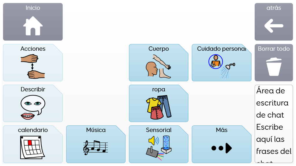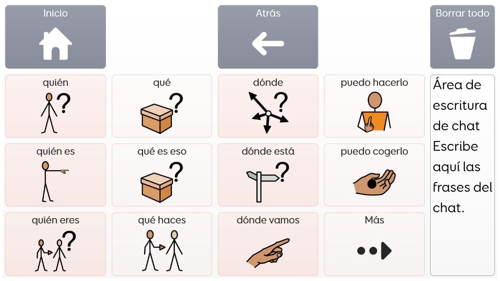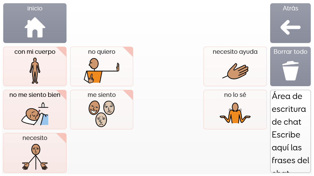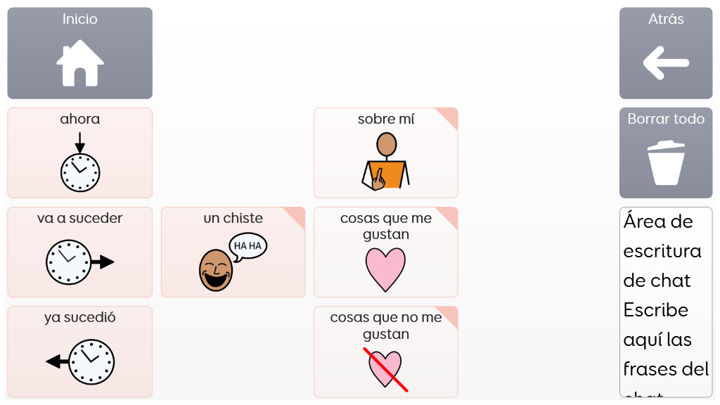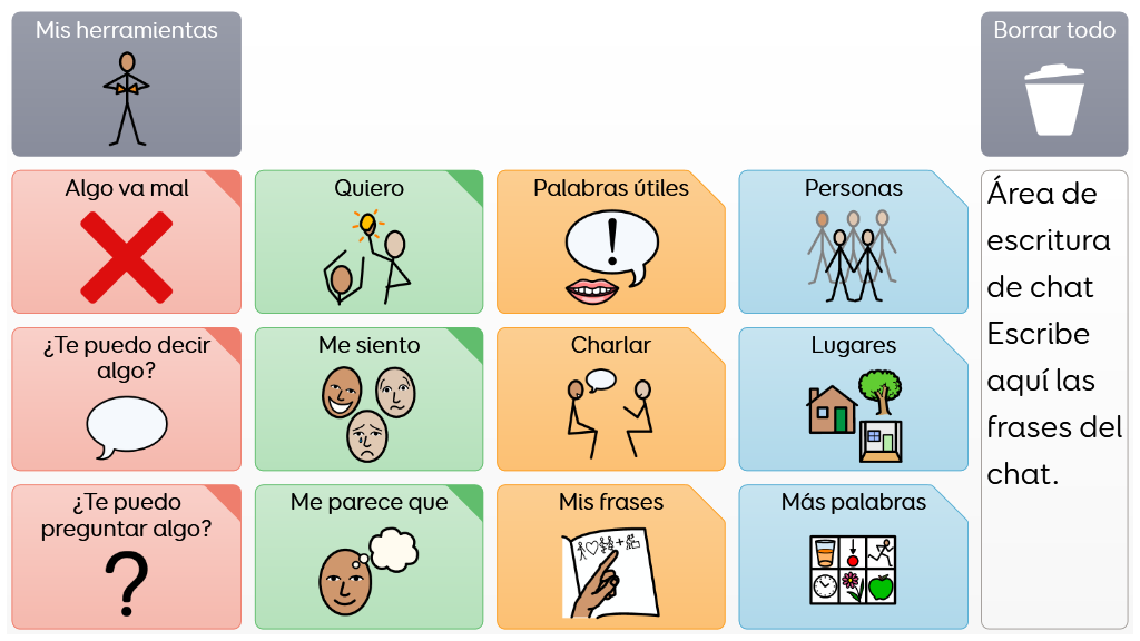Voco Chat es un vocabulario de símbolos con número reducido de celdas, diseñado para permitir a los usuarios comunicarse por varias razones. Las secuencias de mensajes, con saltos incorporados y vocabulario cuidadosamente seleccionado, brindan un apoyo al lenguaje, y el paquete de cuadrículas incluye recursos para promover la comunicación y el bienestar emocional, además de aplicaciones como Symoji y Camera que facilitan la interacción y la motivación. Voco Chat es adecuado para cualquier persona que necesite celdas más grandes y se puede utilizar con pantalla táctil, mirada, puntero y pulsadores. Incluye indicaciones auditivas tanto para columnas como para celdas individuales. Al añadir Voco Chat por primera vez, puedes seleccionar "Niño/a" o "Adolescente y adulto" para elegir el vocabulario más apropiado para el usuario.