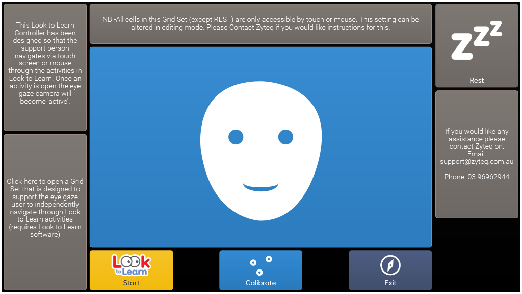 A simple computer control grid set which allows an eye gaze user to move the mouse pointer in Look to Learn activities. A settings grid enables a facilitator to check positioning and calibrate the eye gaze camera.