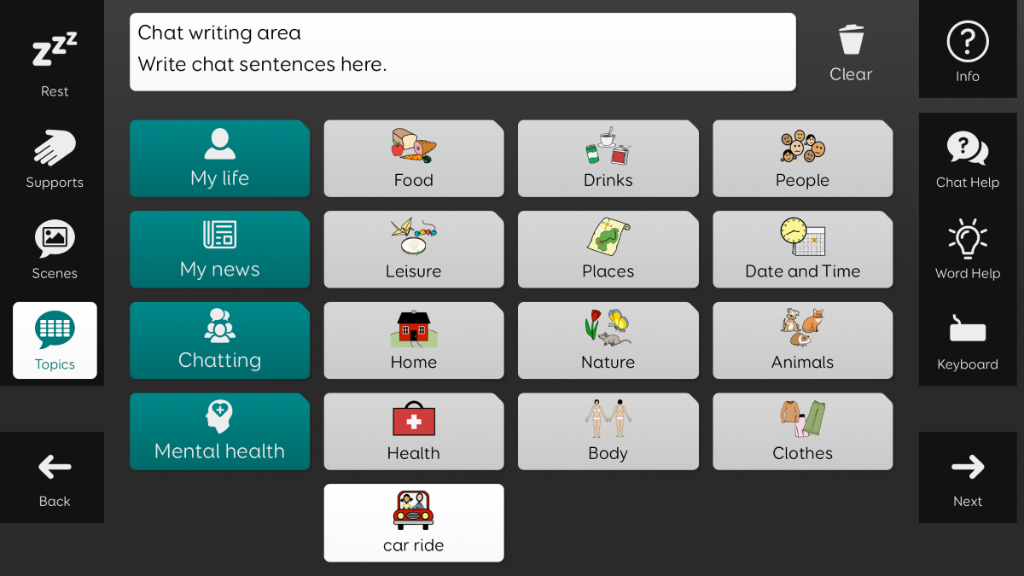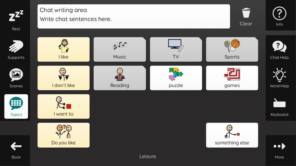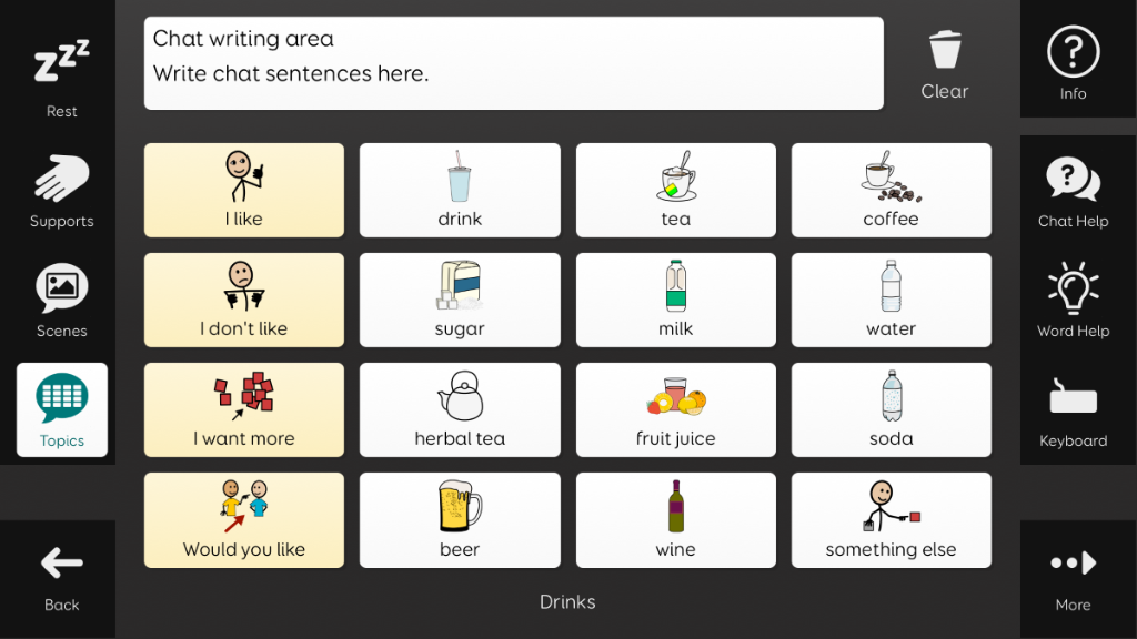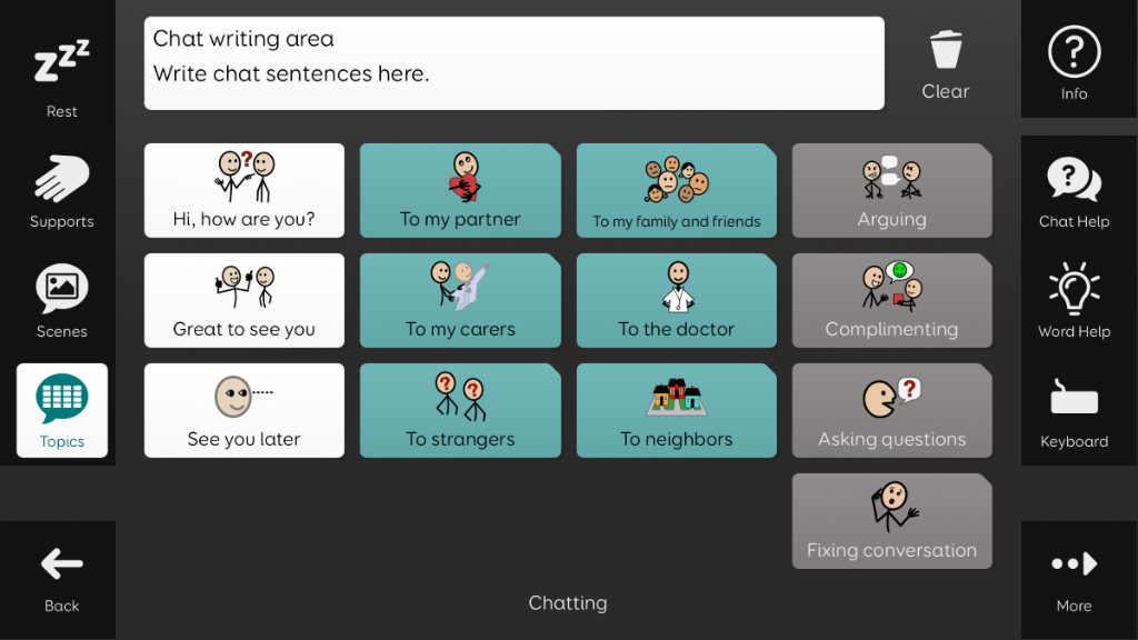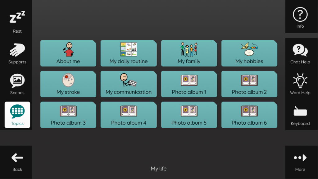 Aphasia Duo has been created for adults who have aphasia, who would benefit from a symbol supported vocabulary. Its aim is to enable people with aphasia to communicate for a wide range of reasons, with help from a range of communication supports. Aphasia Duo 16 may be better suited to those with less severe language, cognitive, visual or physical difficulties, or for individuals where word finding is their main difficulty. It includes tools to support word finding, such as picture dictionaries and a word bank. Aphasia Duo is compatible with keyguards, and can be used with any access method. v1.3 Note: This grid set requires Grid v94 or above