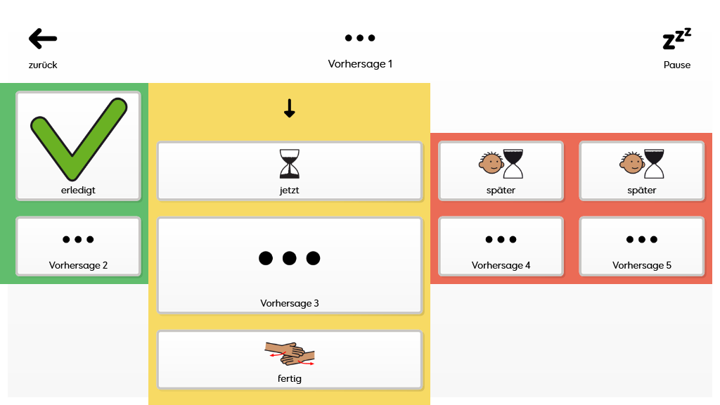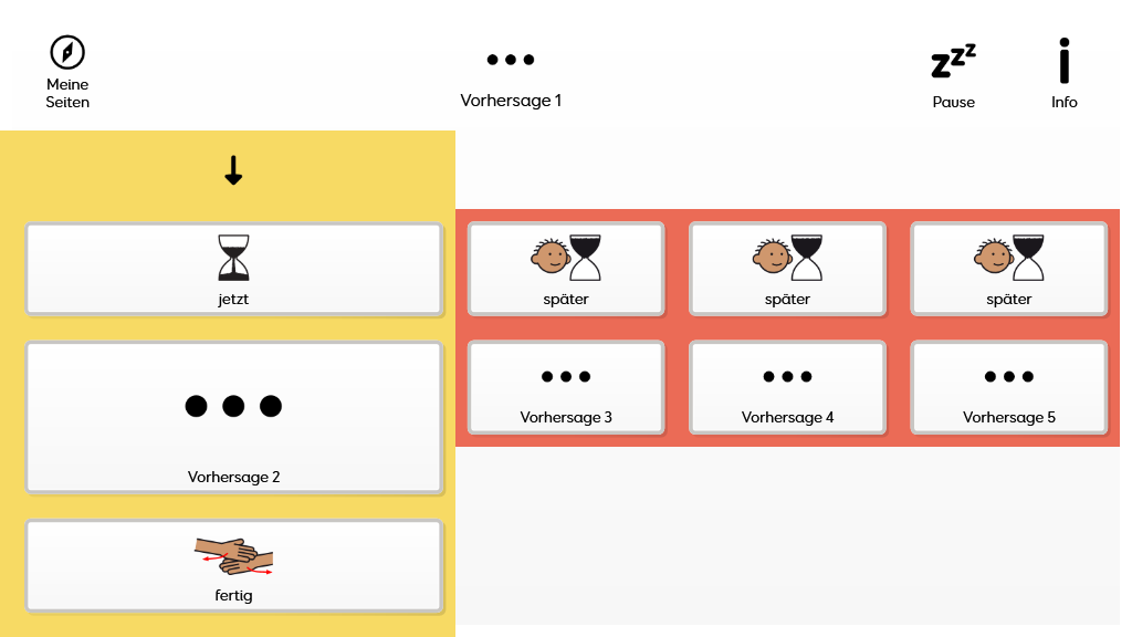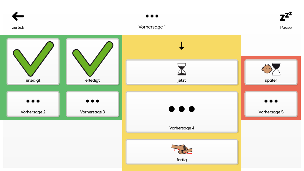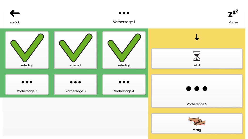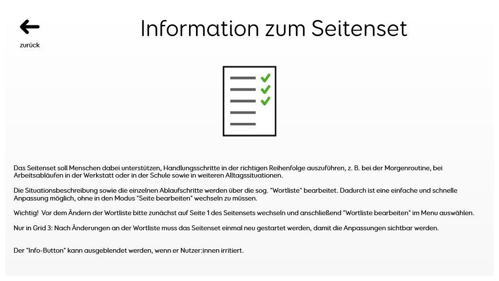 Das Seitenset soll Menschen dabei unterstützen, Handlungsschritte in der richtigen Reihenfolge auszuführen, z. B. bei der Morgenroutine, bei Arbeitsabläufen in der Werkstatt oder in der Schule sowie in weiteren Alltagssituationen. Die Situationsbeschreibung sowie die einzelnen Ablaufschritte werden über die sog. "Wortliste" bearbeitet. Dadurch ist eine einfache und schnelle Anpassung möglich, ohne in den Modus "Seite bearbeiten" wechseln zu müssen.