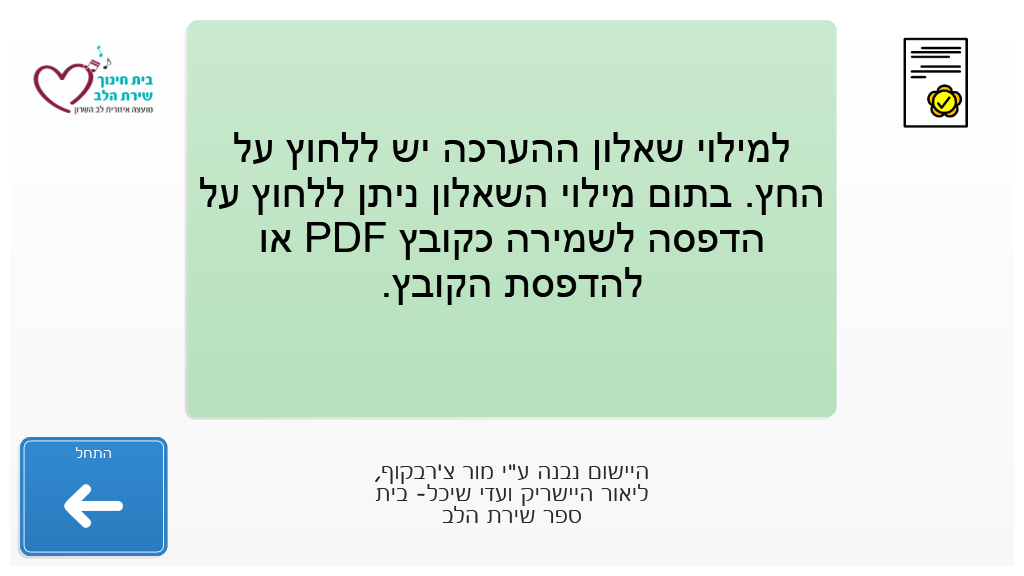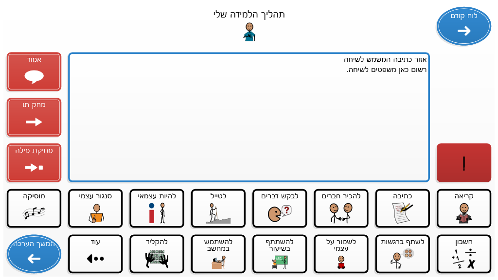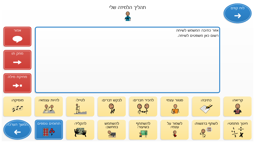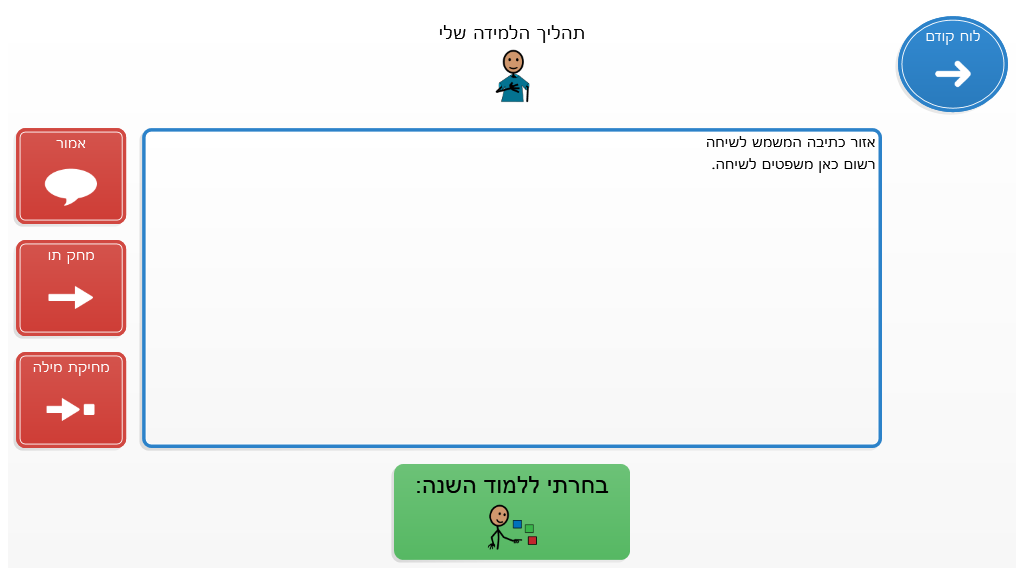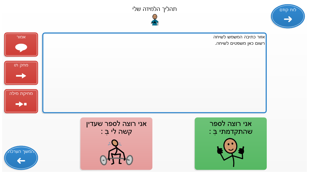 יישום הנועד לביצוע הערכה עצמית של תלמידים אודות התקדמוצתם בשנת הלימודים. הלוח מהווה יישום המשך ליישום "בחירת מטרות לשנת הלימודים", בכך שמאפשר הערכה באותם התחומים/ מטרות ויעדים שנבחרו ע"י התלמיד. בסוף היישום אפשרות להצגת המסמך ושמירתו כקובץ/ הדפסתו.