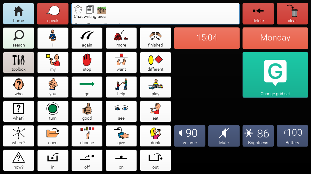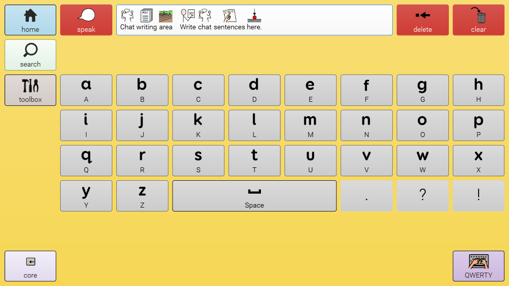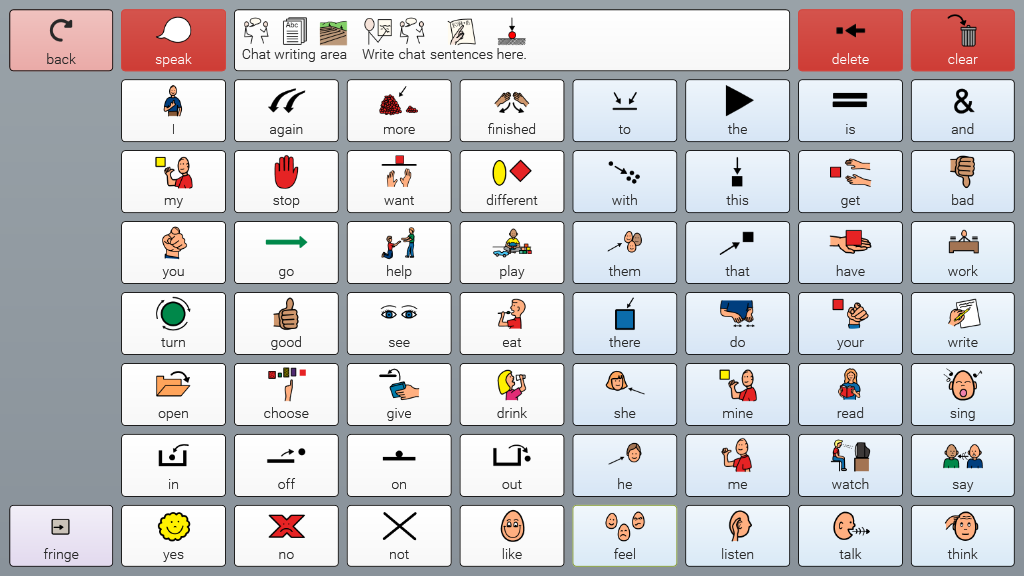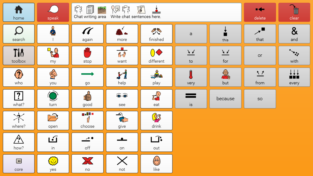 English language core word symbol-based communication (Can be used alongside the 'Dewch i Siarad' gridset for a bilingual system)