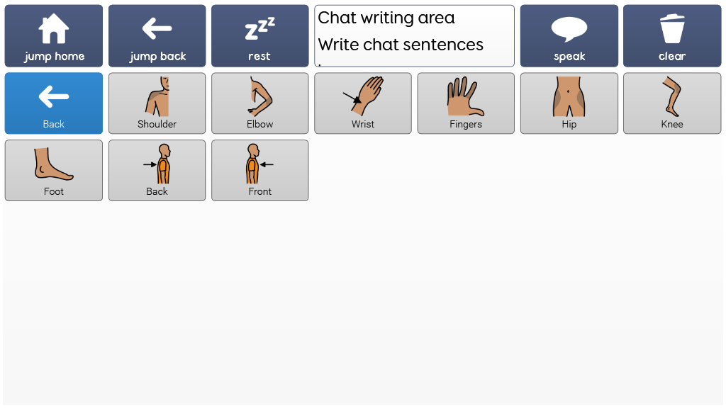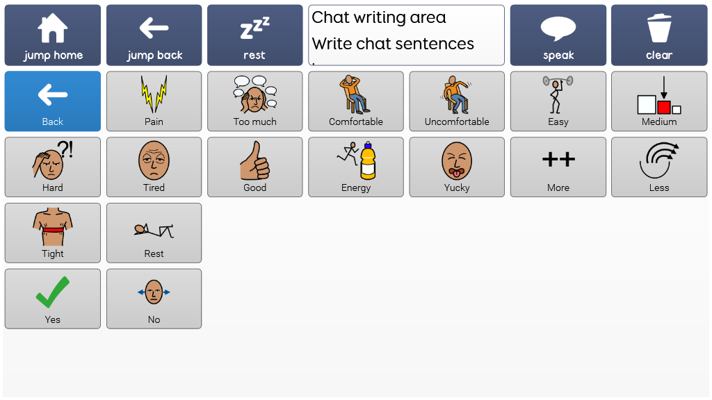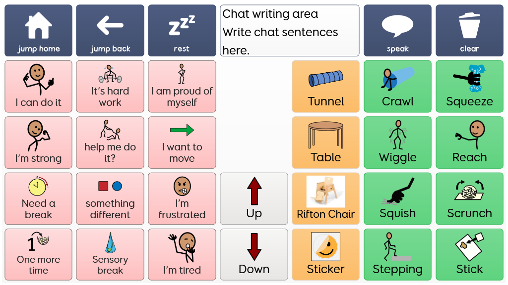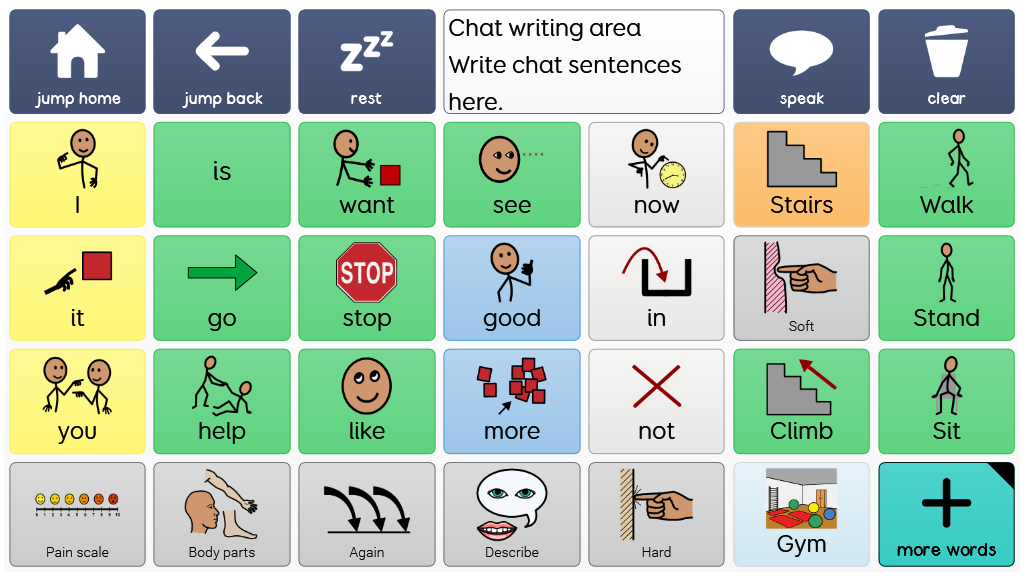 A Super Core 30 page for toddler physical therapy, with a core words page based on the daily activities grid and an expanded page with phrases associated with PT, as well as verbs and vocabulary.