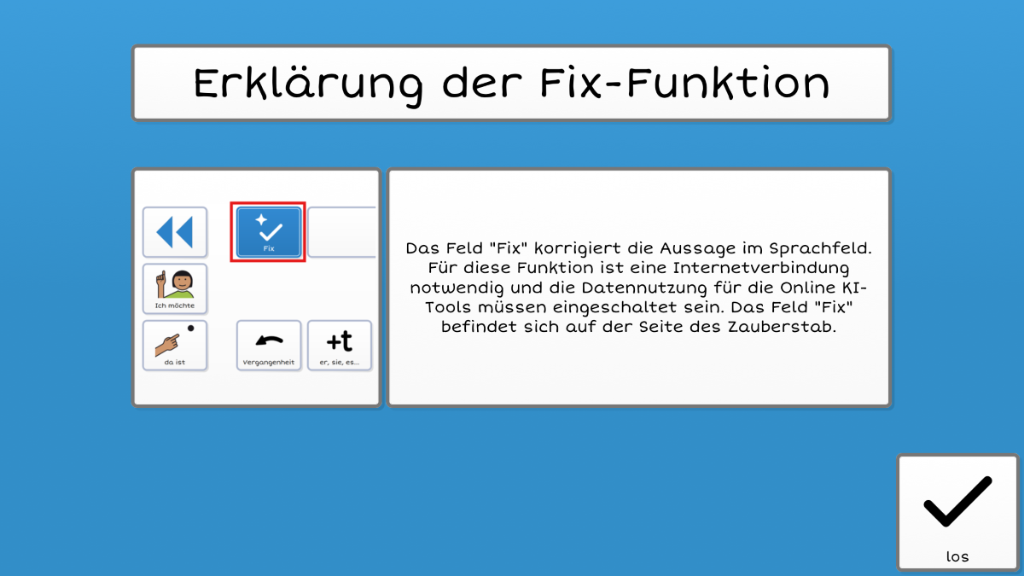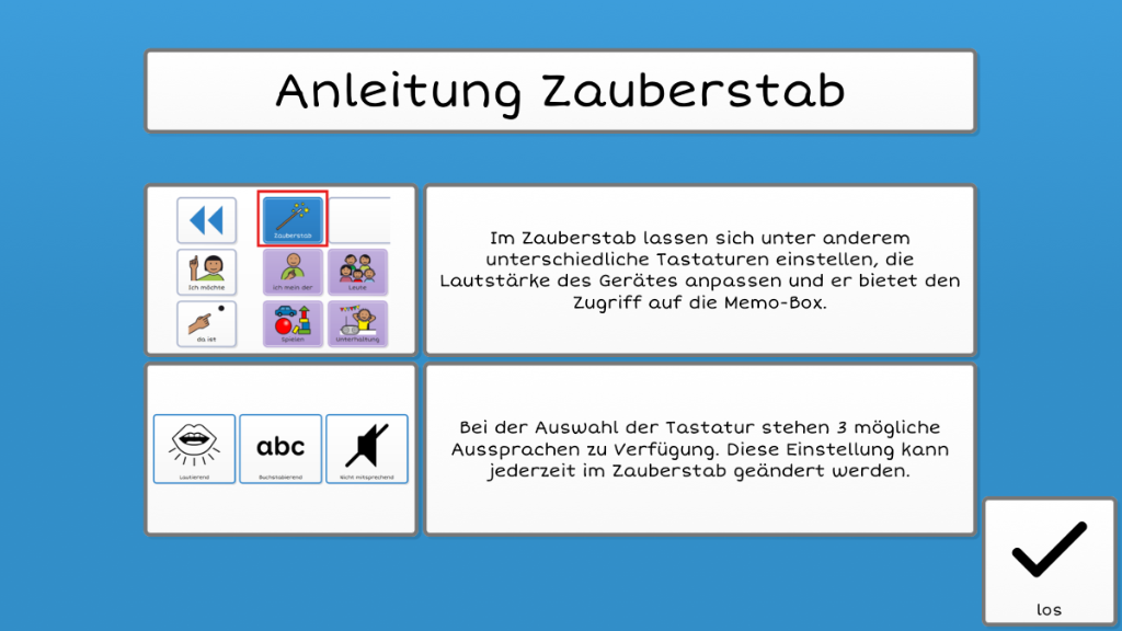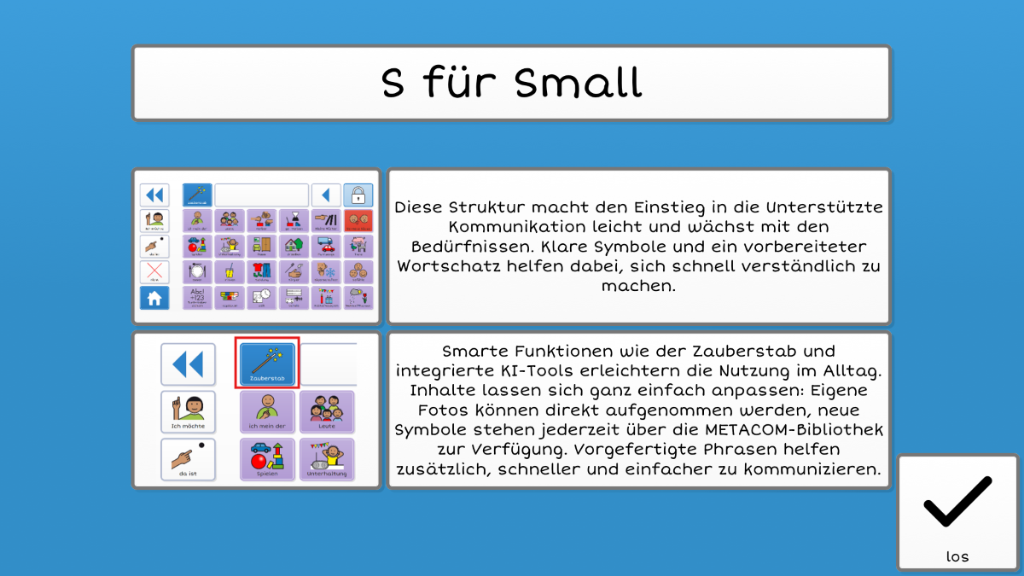 Diese Struktur bietet einen idealen Einstieg in die Unterstützte Kommunikation – und wächst flexibel mit den Bedürfnissen der Nutzer:innen. Dank der klar strukturierten, leicht verständlichen Symbole und eines vorgefertigten Wortschatzes, gelingt Kommunikation schnell, intuitiv und effektiv. Smarte Grid-Funktionen wie der Zauberstab, integrierte Online-KI-Tools und verschiedene Tastaturen sind bereits enthalten und sorgen für ein modernes, leistungsstarkes Nutzungserlebnis. Inhalte lassen sich individuell anpassen: Eigene Fotos können direkt über die integrierte Kamera eingebunden werden, neue Seiten und Symbole stehen aus der umfangreichen METACOM-Bibliothek jederzeit zur Verfügung. Vorgefertigte Phrasen beschleunigen zusätzlich die Kommunikation und unterstützen den Alltag spürbar.