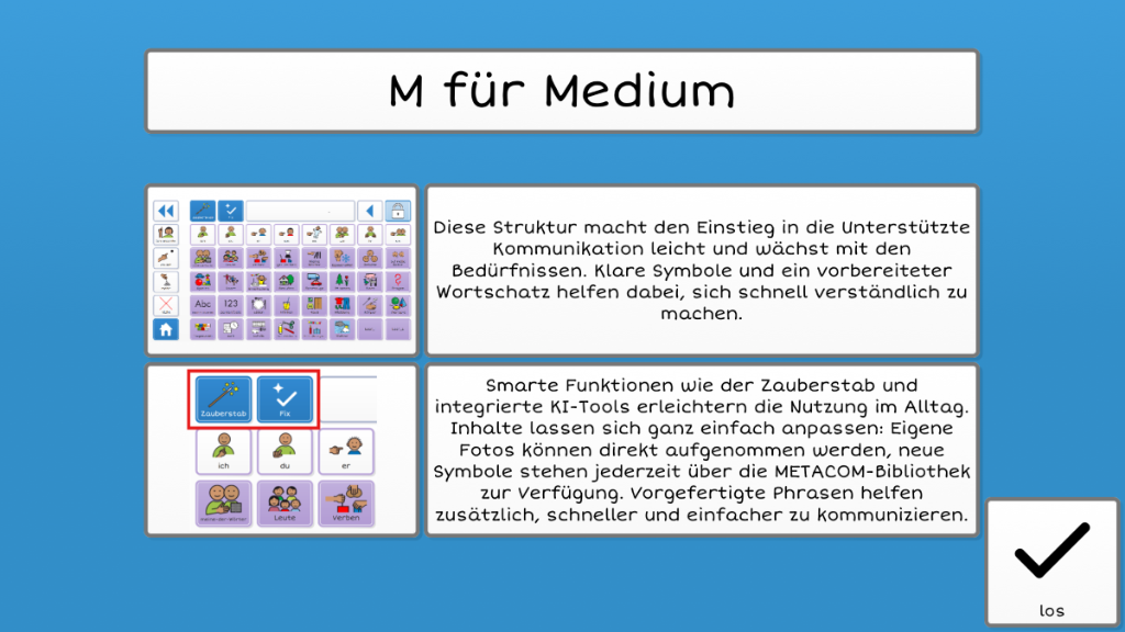 Diese Struktur bietet einen idealen Einstieg in die Unterstützte Kommunikation – und wächst flexibel mit den Bedürfnissen der Nutzer:innen. Dank der klar strukturierten, leicht verständlichen Symbole und eines vorgefertigten Wortschatzes, gelingt Kommunikation schnell, intuitiv und effektiv. Smarte Grid-Funktionen wie der Zauberstab, integrierte Online-KI-Tools und verschiedene Tastaturen sind bereits enthalten und sorgen für ein modernes, leistungsstarkes Nutzungserlebnis. Inhalte lassen sich individuell anpassen: Eigene Fotos können direkt über die integrierte Kamera eingebunden werden, neue Seiten und Symbole stehen aus der umfangreichen METACOM-Bibliothek jederzeit zur Verfügung. Vorgefertigte Phrasen beschleunigen zusätzlich die Kommunikation und unterstützen den Alltag spürbar.