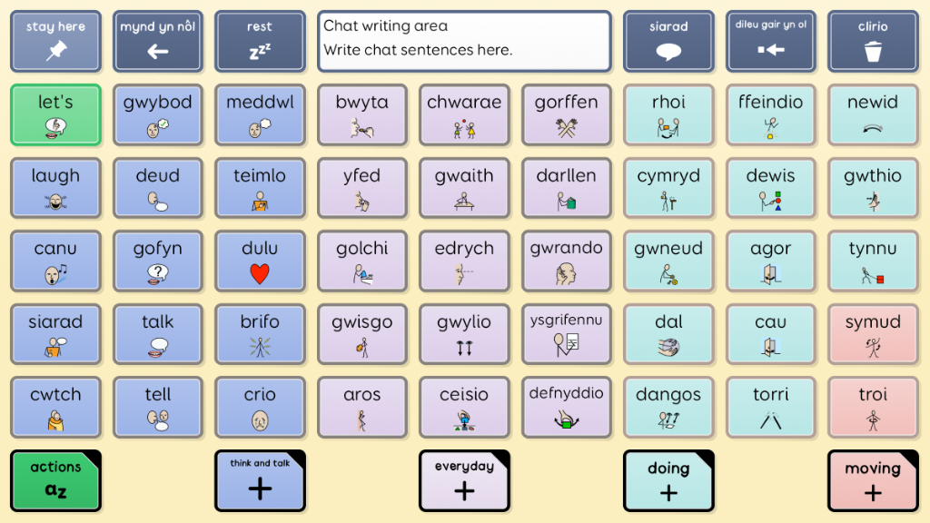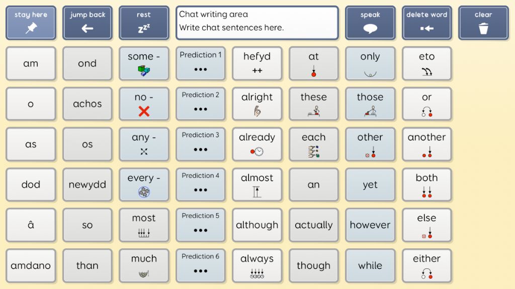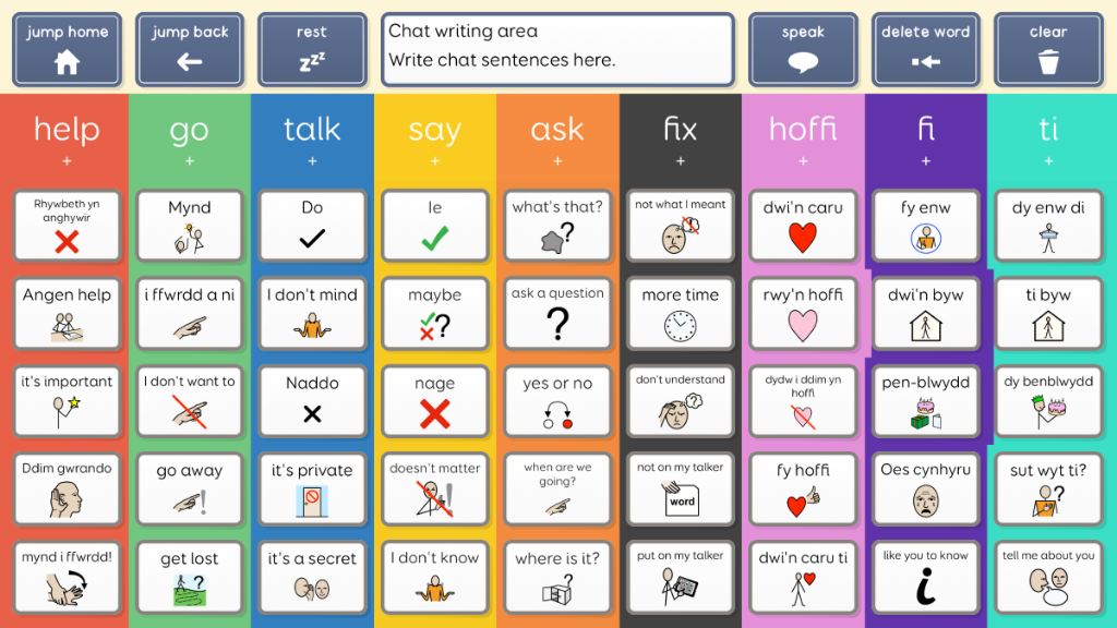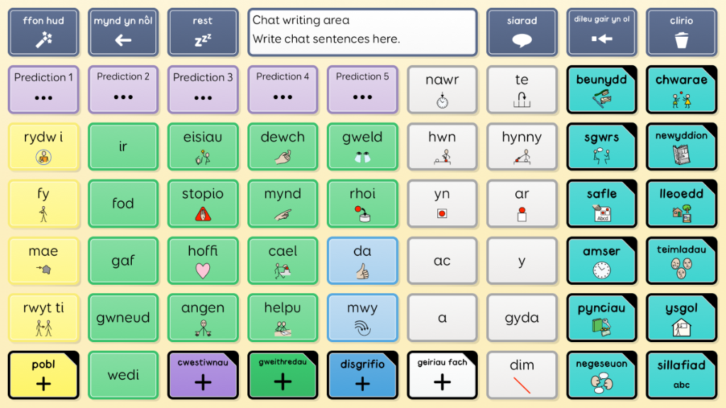 This is a Welsh translation of Super Core 50. It has been made by a parent of an AAC user, and is currently under development. Message from the AAC users parent: This home made grid set was produced by a welsh learner and there will be incorrect terms and phrases. If you wish to contribute time and knowledge to improve this grid set so that Welsh Language users benefit, please do. This has been created so that there are better options for welsh speakers and welsh learners to access Welsh Langauge through AAC. Diolch yn fawr iawn