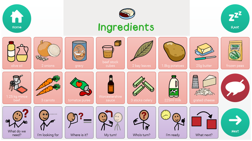 This gridset is for cottage pie recipe, however, it can be used as a template for creating and storing symbolised recipes in Grid 3.