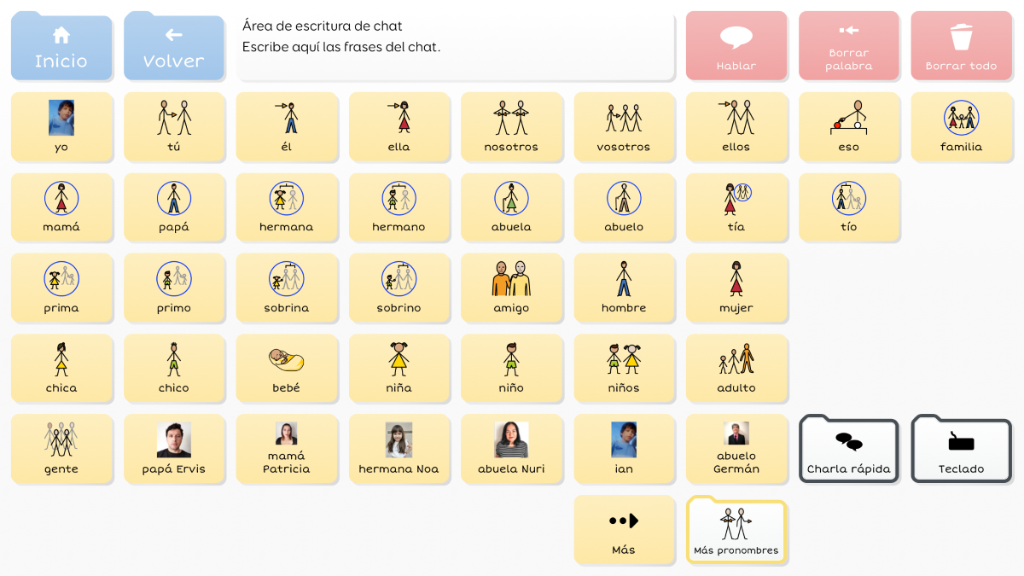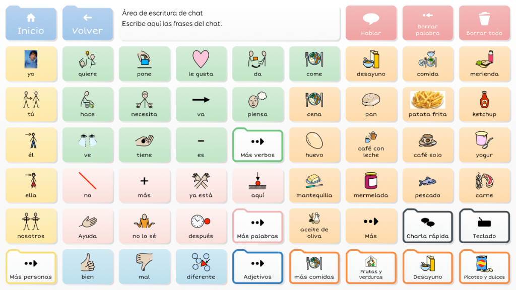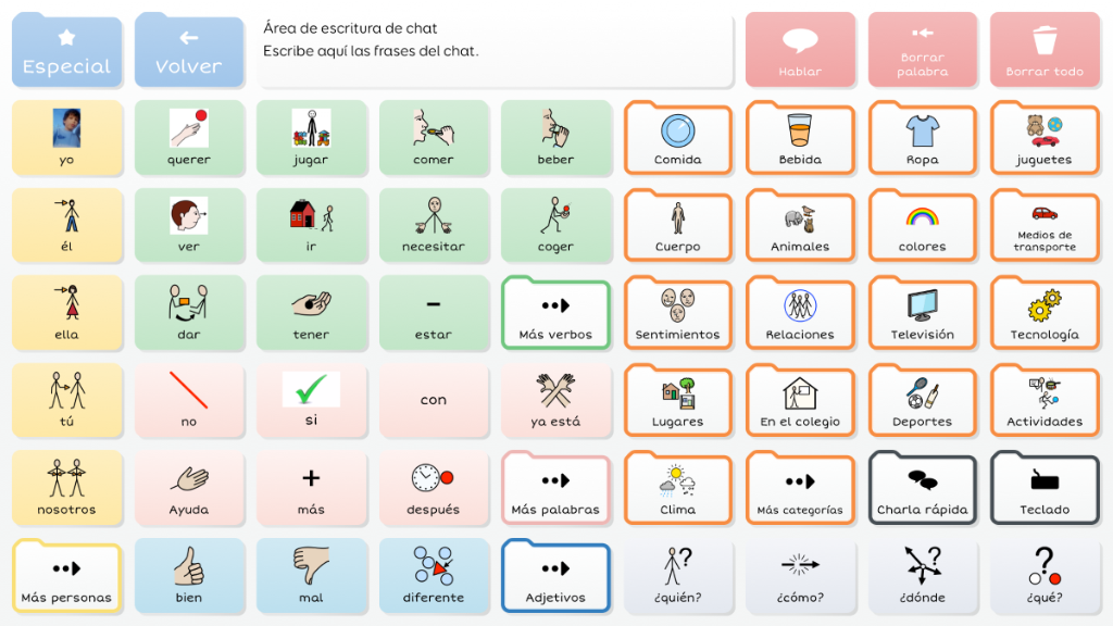 Symbol Talker G divide la pantalla en dos partes: una destinada al vocabulario núcleo y otra al vocabulario periférico. Esto significa que puedes generar frases nuevas de manera rápida y adaptada al contexto. Las herramientas de gramática inteligente de Grid 3 te ayudarán a generar frases gramaticalmente correctas con pocas selecciones. Este gridset es una evolución de BJ Adaptaciones sobre Symbol Talker D y Symbol Talker Núcleo