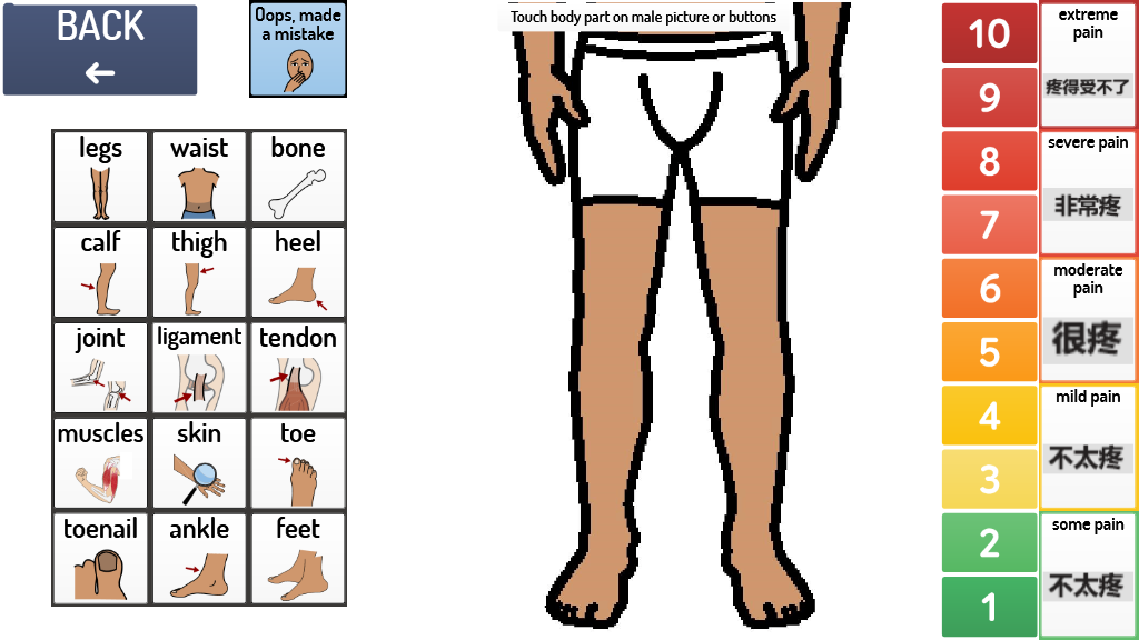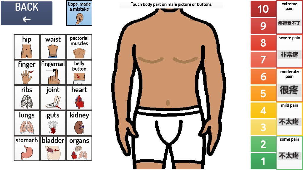 ACETS version of a Communication Access board for acute care settings. Created for Chinese client with translation to English speaking carers.