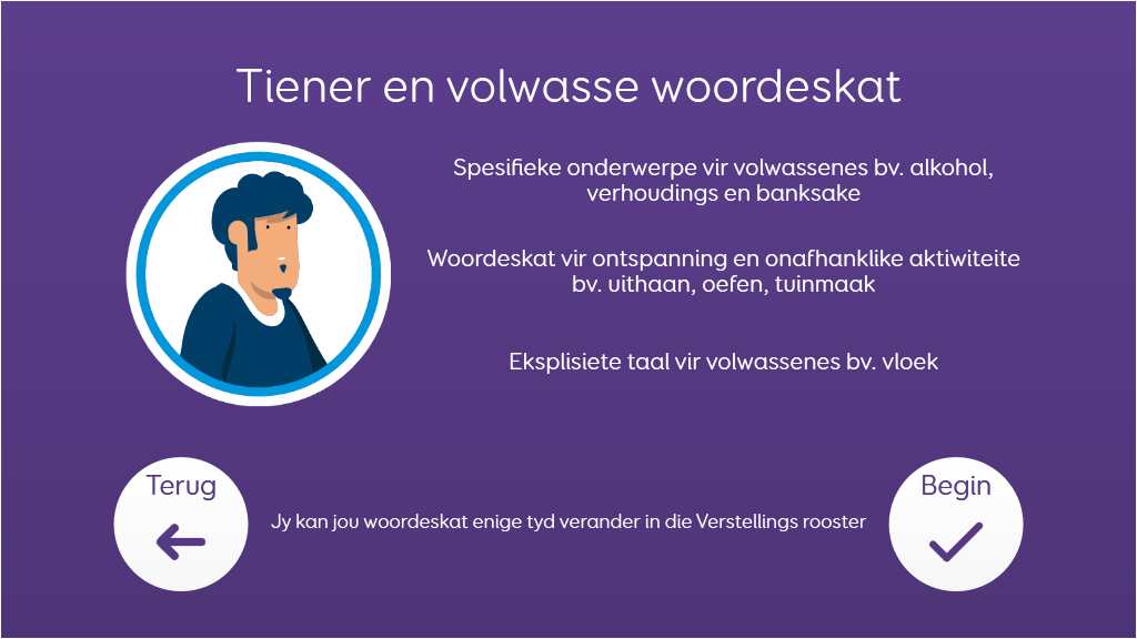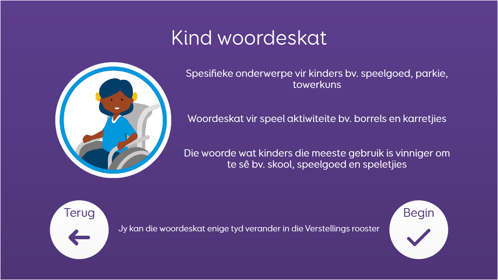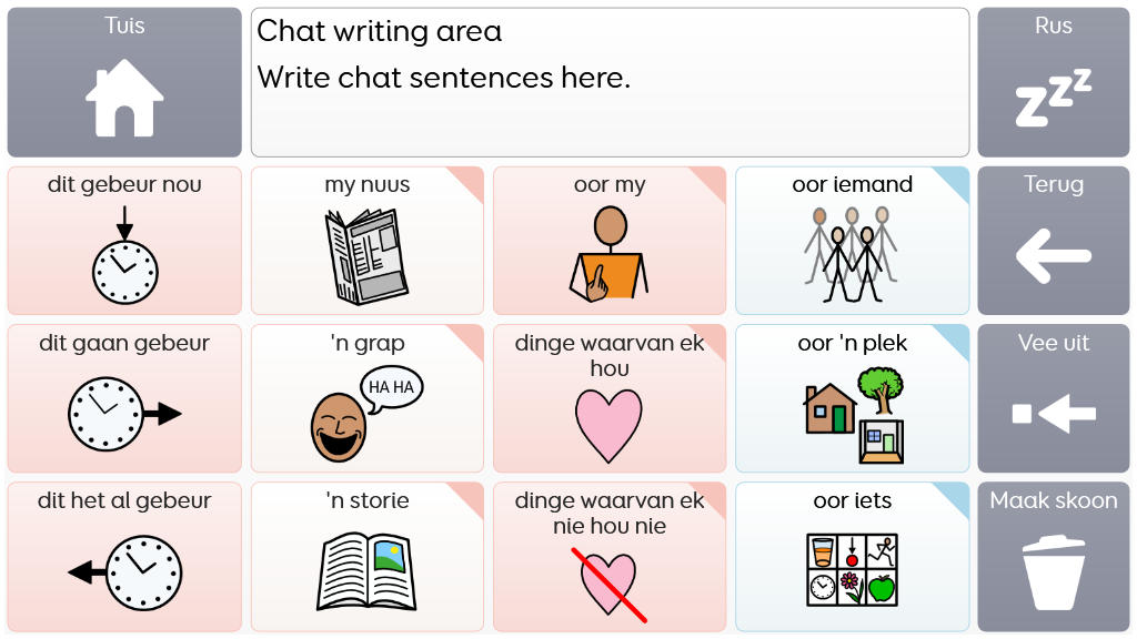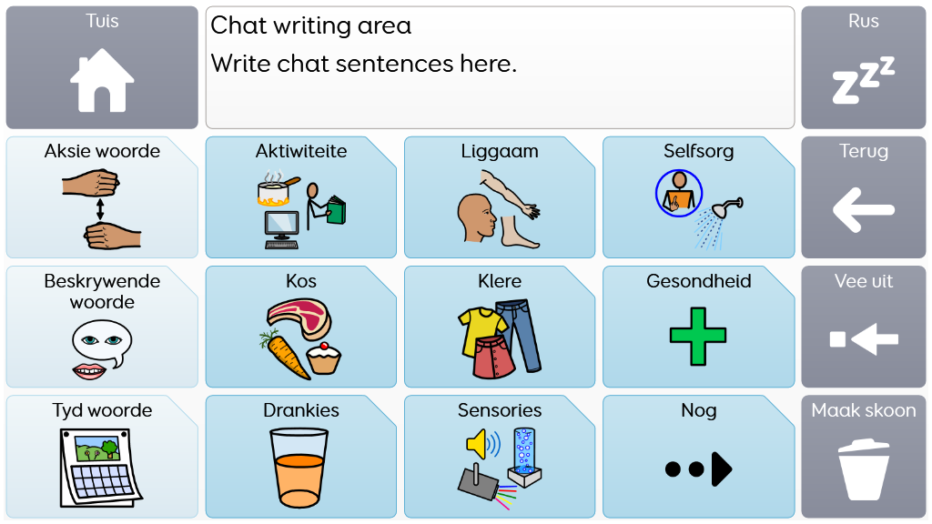 Voco Chat is ‘n lae seltelling simbool woordeskat wat ontwerp is om gebruiker in staat te stel om vir ‘n verskeidenheid redes te kan kommunikeer. Boodskap paaie, met ingeboude spronge en uitgekose woordeskat bied ‘n ondersteunende benadering tot taal. Die rooster stel bevat bronne wat kommunikasie en emosionele welstand bevorder, met toeps soos Symoji en Kamera om interaksie en betrokkenheid aan te moedig. Voco Chat is geskik vir enige iemand wat groter teikens benodig en kan gebruik word met oogvolg, tas, wiser en skakelaar toegang. Ouditiewe wenke is ingesluit vir kolomme en individuele selle. Wanneer jy Voco Chat vir die eerste keer gebruik kan jy ‘Kind’ of ‘Tiener en Volwassene’ woordeskat kies om die toepaslike woordeskat by die gebruiker te pas. v1.05