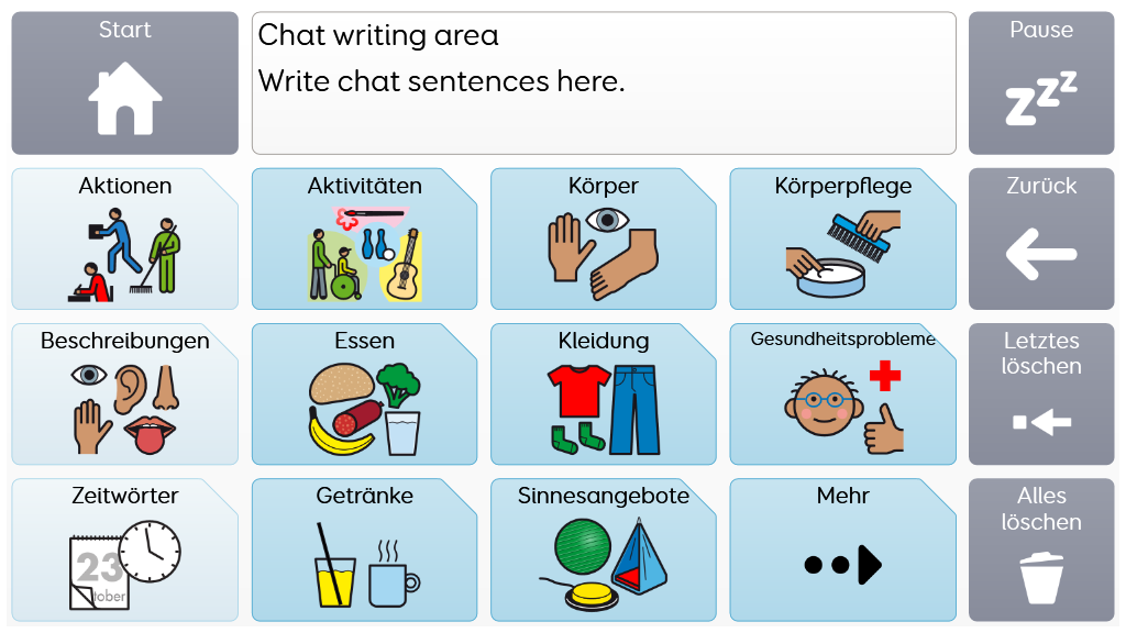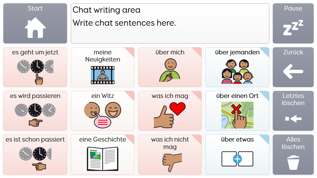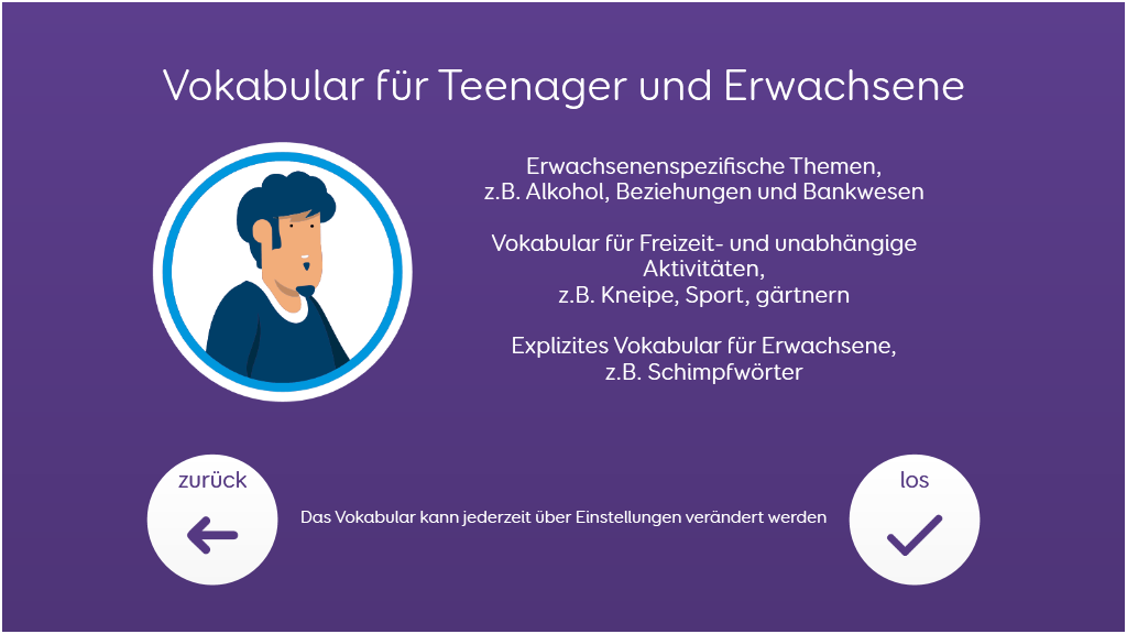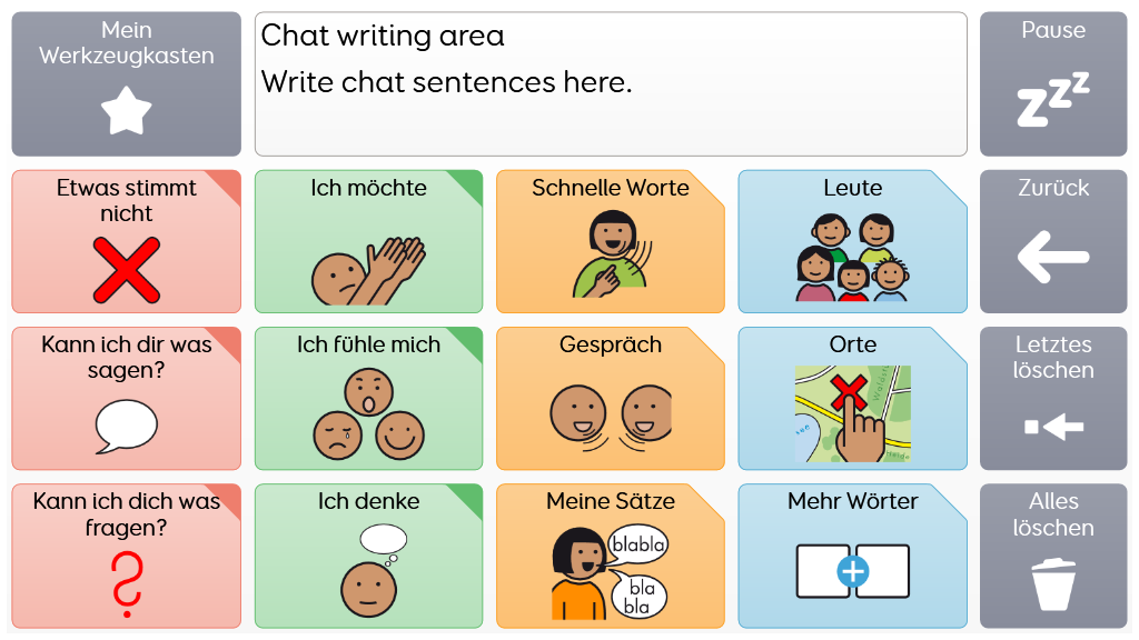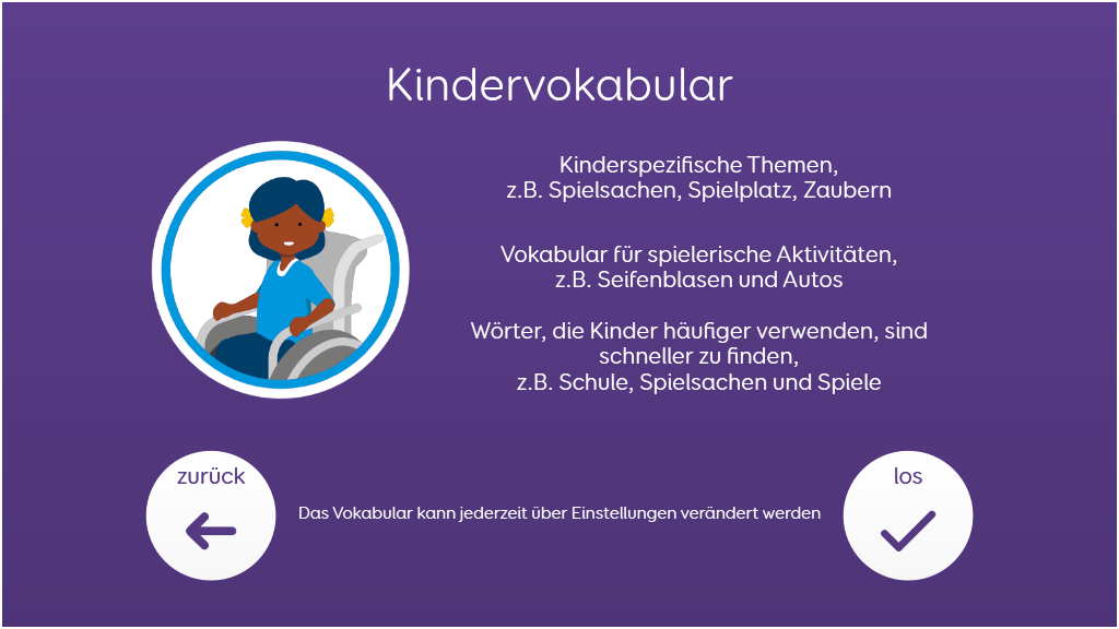 Voco Chat ist ein Symbolvokabular mit geringer Feldanzahl, dass es den NutzerInnen trotzdem ermöglicht, eine Vielzahl von Kommunikationsanlässen und -Funktionen auszudrücken. Das sorgfältig ausgewählte Vokabular sowie die automatische Bildung von Aussagen mittels direkten Verlinkungen - all das unterstützt den Zugang zur Sprache. Das Vokabular enthält Ressourcen zur Förderung der Kommunikation und der emotionalen Regulation bzw. weitere Apps wie Symoji und Kamera zur Unterstützung von Interaktion und Engagement. Voco Chat eignet sich für alle, die größere Felder benötigen und kann über Berührung, Blicke, Mausersatz und Schalter bedient werden. Auditive Hinweise fürs Scanning sind sowohl für Spalten als auch für einzelne Zellen enthalten. Wenn Sie Voco Chat zum ersten Mal öffnen, können Sie entweder "Kind" oder "Jugendlicher und Erwachsener" auswählen, um das am besten geeignete Vokabular für den Benutzer zu wählen. v1.06