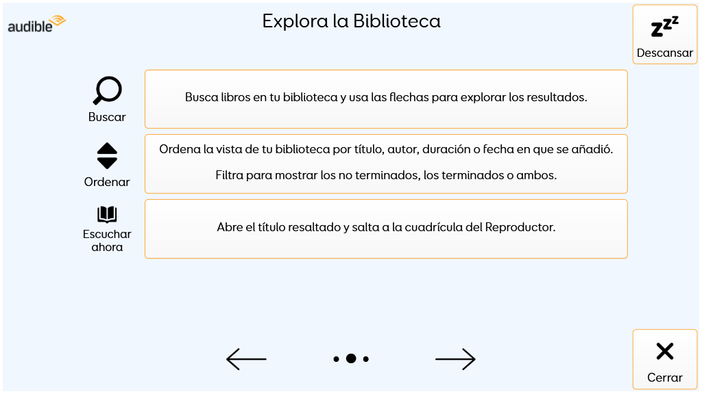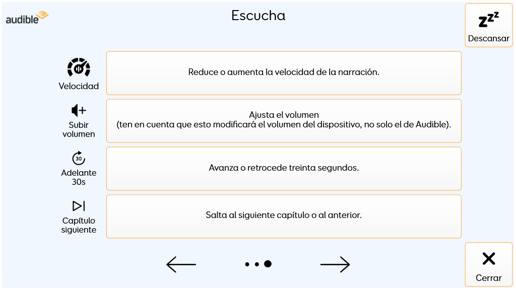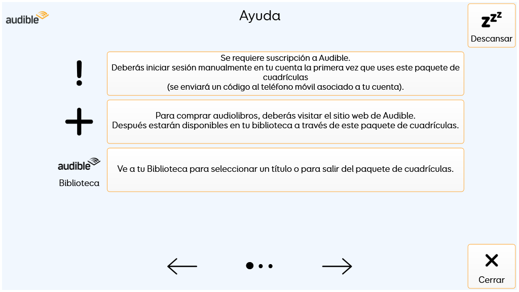 Accede a la plataforma web de Audible para escuchar audiolibros directamente desde Grid 3. Explora tu biblioteca y ¡empieza a escuchar! Es necesario tener una cuenta de Audible. Este paquete de cuadrículas funciona únicamente como reproductor. Para buscar o comprar nuevos títulos necesitas usar un navegador estándar. v1.0