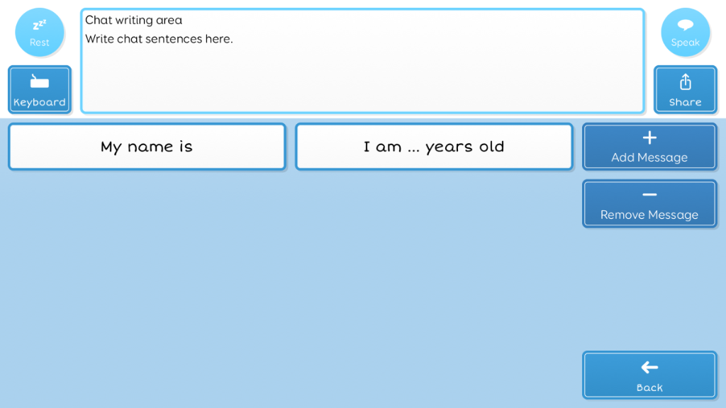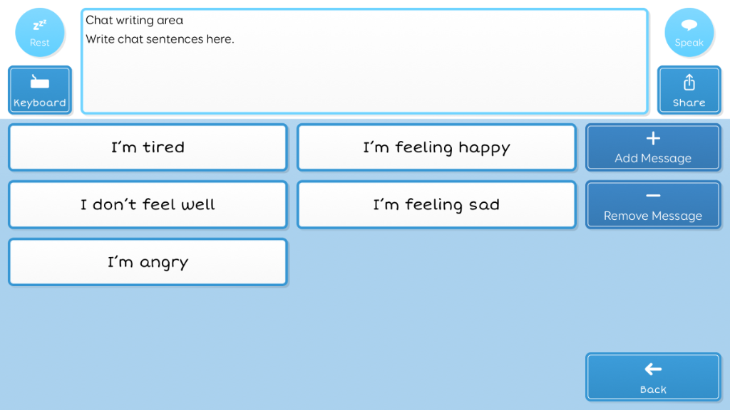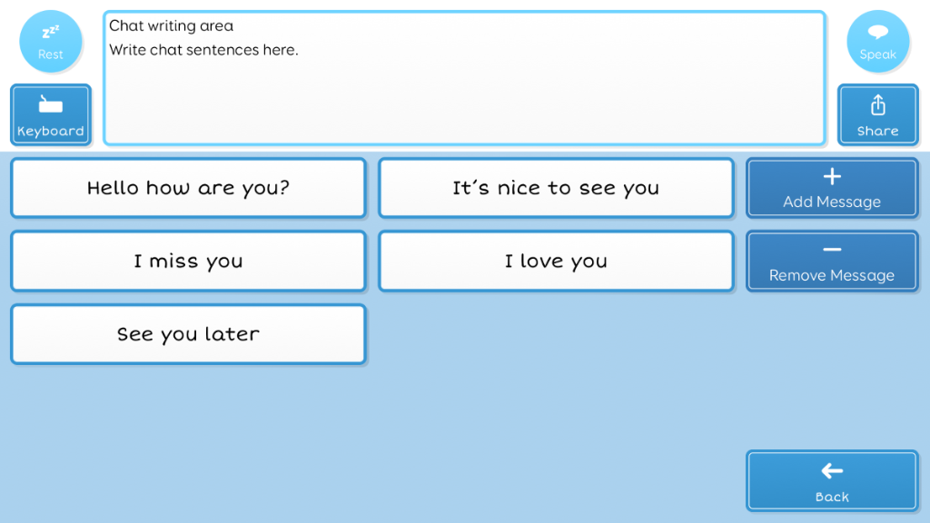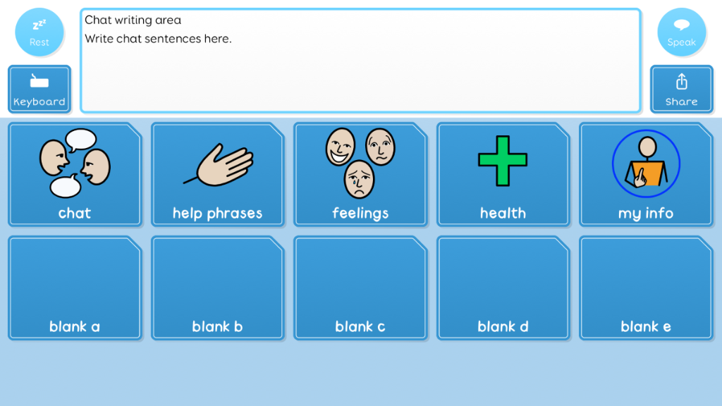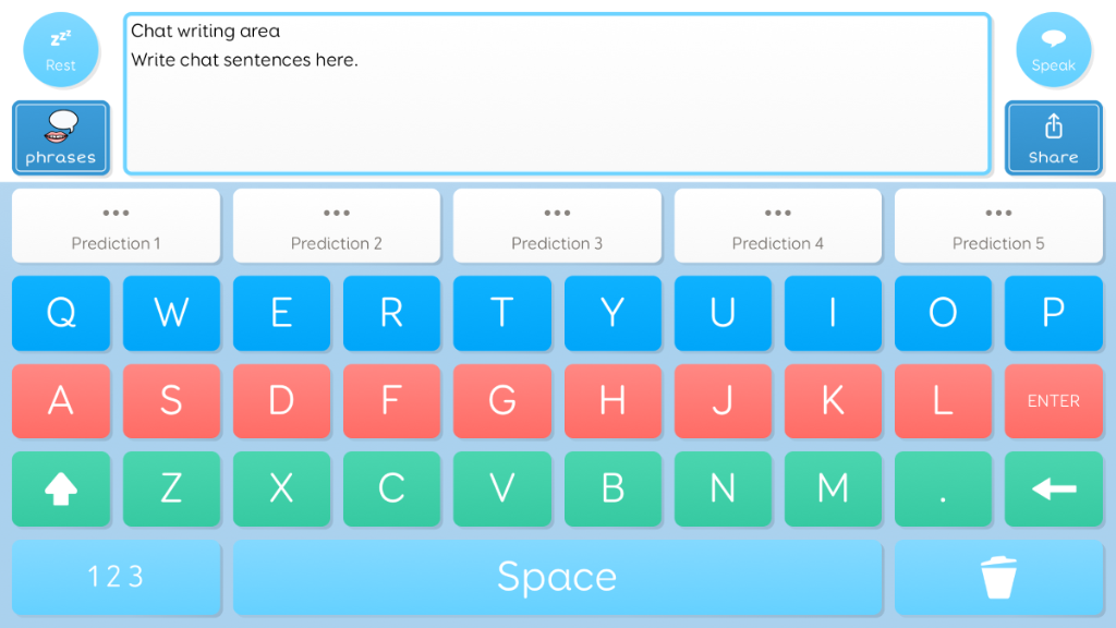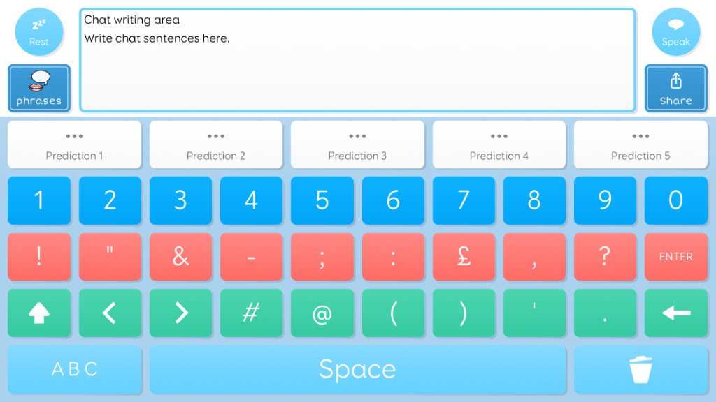 A simple keyboard with colourful keys and symbolised prediction cells. Plus stored phrases and ability to share text with other apps.