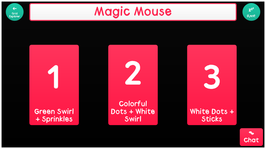 Magic Mouse - modified to have 2 large cells per page Select a pattern and watch the Magic Mouse leave beautiful trails across the screen. This grid set helps develop early cause and effect skills. Interactive Learning activities are designed to be motivating and fun while teaching key access skills. The included chat grids enable you to talk about what you have achieved, helping progress towards alternative communication.
