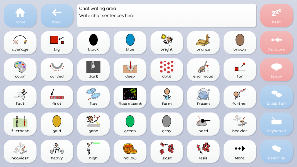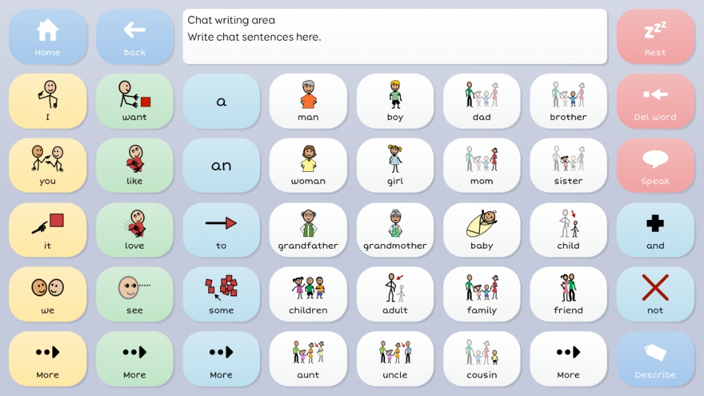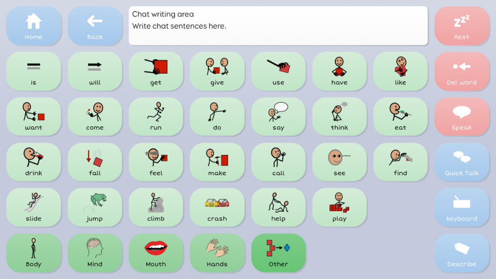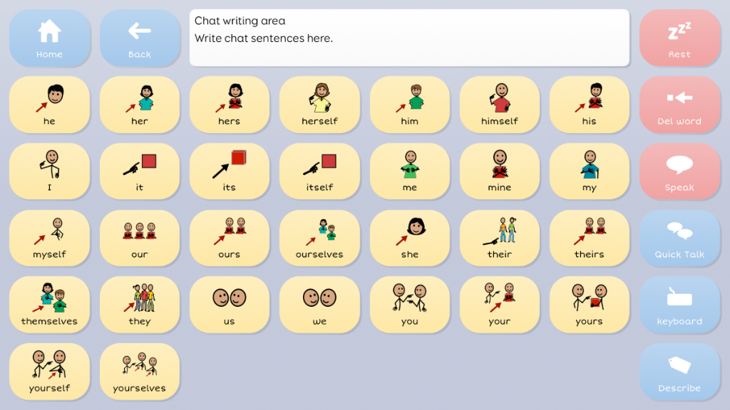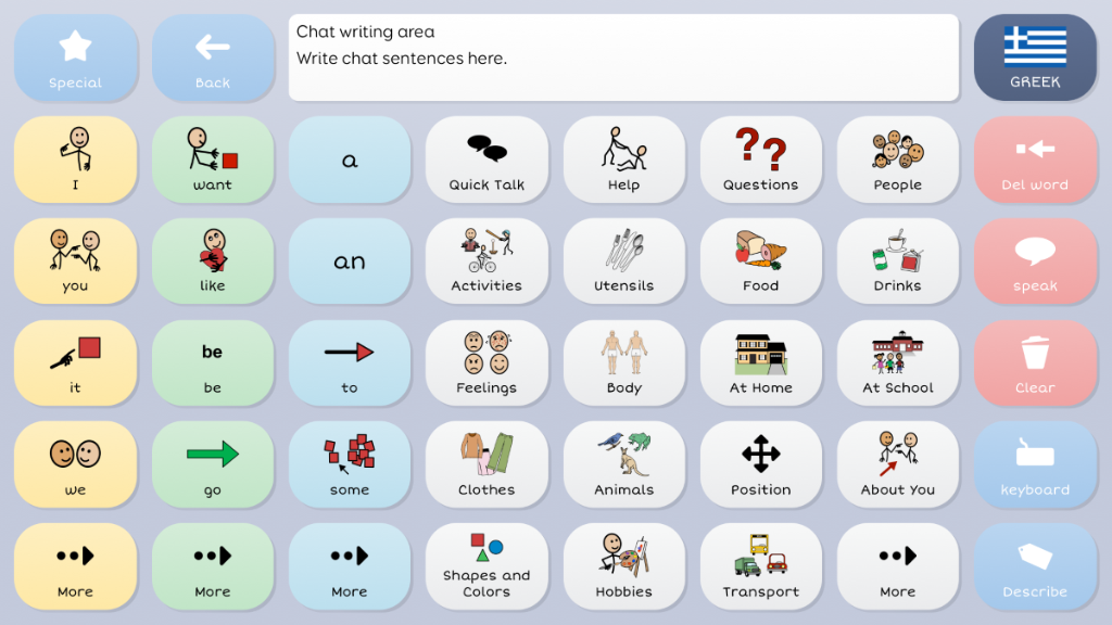 Symbol Talker C provides a transition for people that have successfully communicated with a topic based vocabulary and are ready to use more language tools to say more. Core vocabulary is the name given to the words we speak most often. In Symbol Talker C you can access core vocabulary on each topic grid, giving you the power to create a much wider variety of sentences. Single button to toggle between English and Greek Vocabs