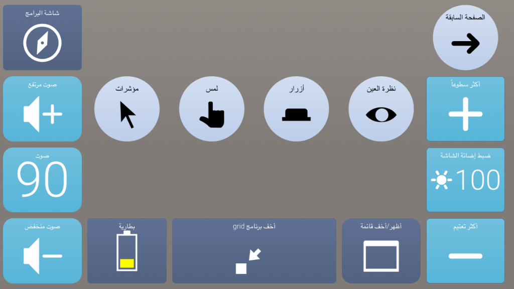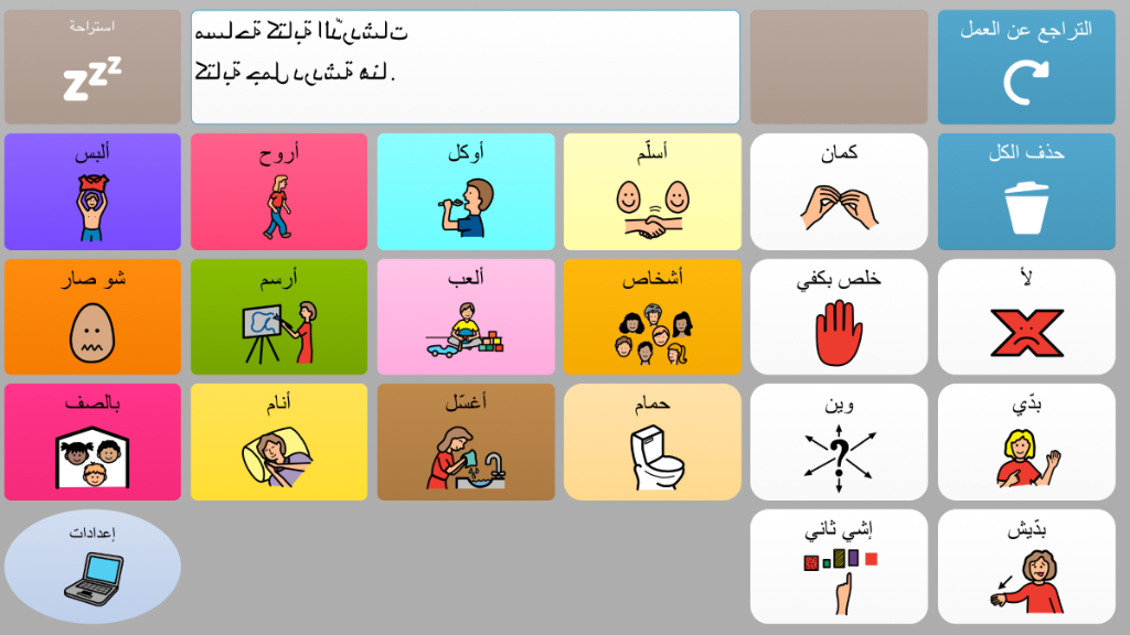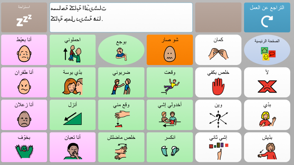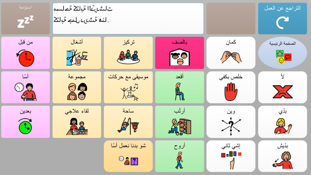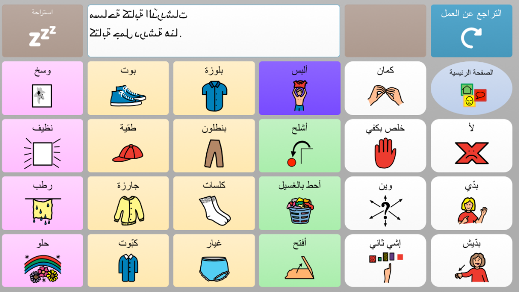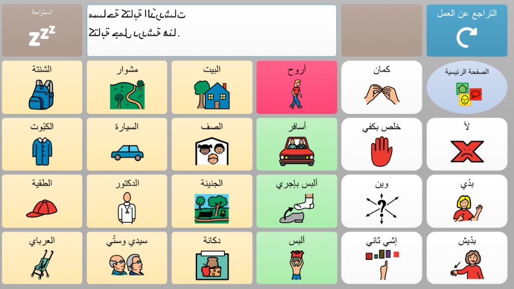 برنامج لوحات, يحتوي على لوحات أساسية لعدد محدود من الحالات النموذجية من عالم الطفل. الصفحة الرئيسية هي صفحة قائمة تحتوي على روابط لحالات مختلفة. على الجانب الأيمن من كل صفحة هناك كلمات ثابتة وباقي الصفحة تحتوي على الأفعال والصفات مرتبة من اليمين إلى اليسار. يحتوي البرنامج أيضاً على تطبيقات ترفيهية لعرض الصور ومقاطع الفيديو. يتضمن البرنامج 27 صفحة من حوالي 300 كلمة. برنامج لوحات للمذكر ، على أساس رموز PCS.