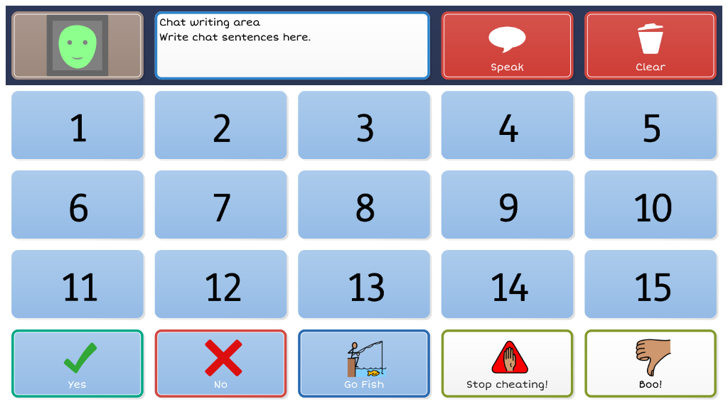 To be used in conjunction with playing cards. This grid set supports students who use eye gaze in playing a game of Go Fish with a peer. Individual cards can be hidden if the student is working on a smaller set of numbers.