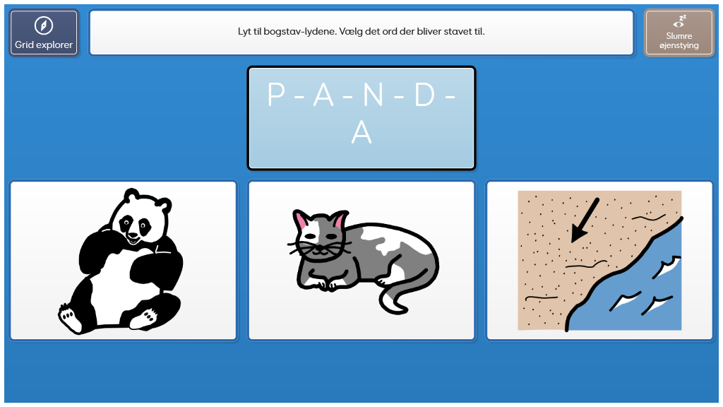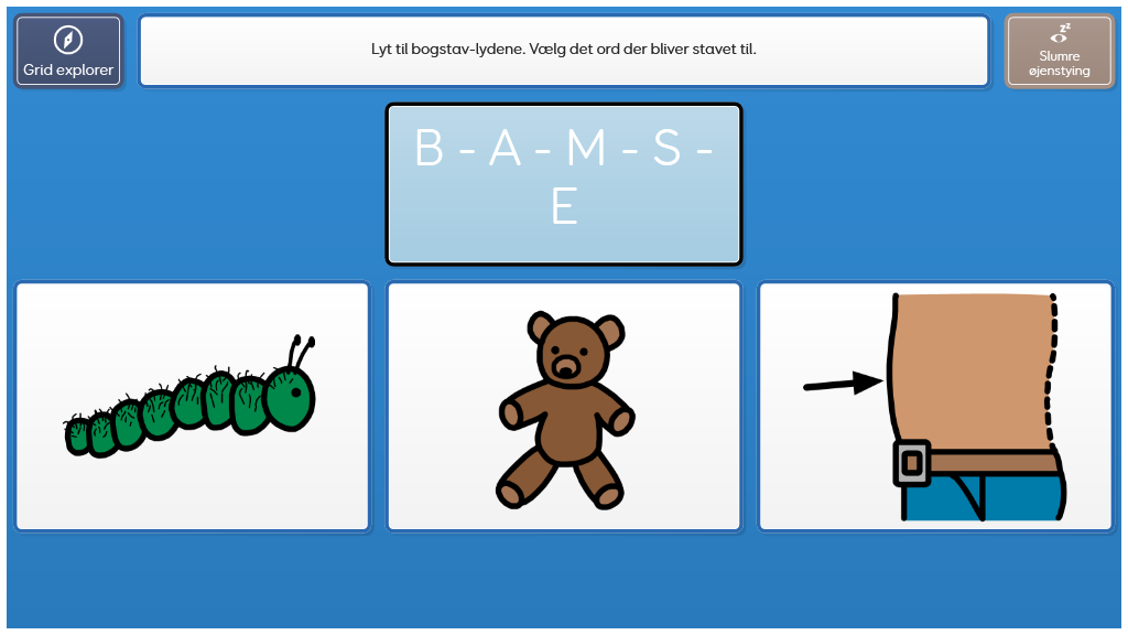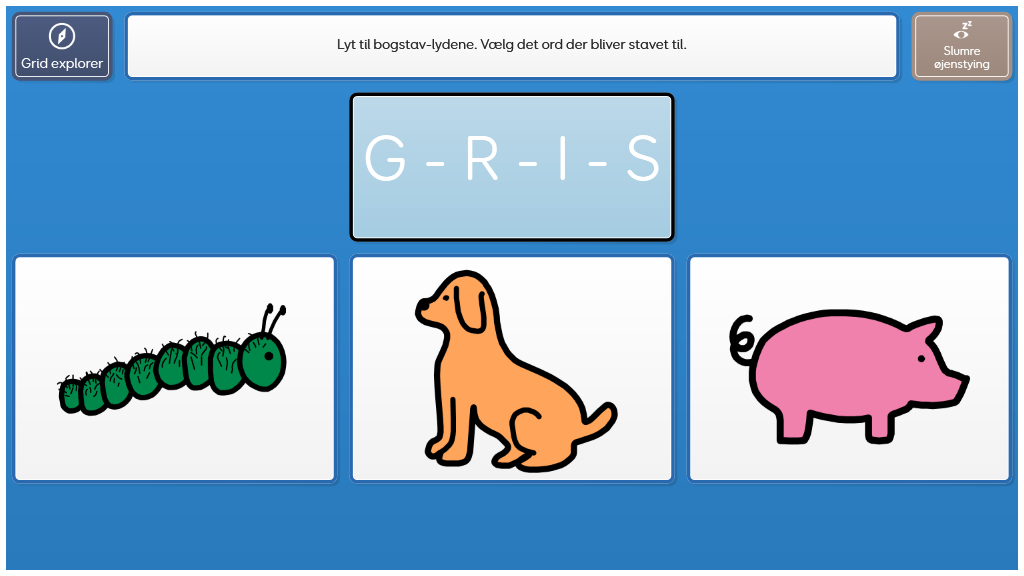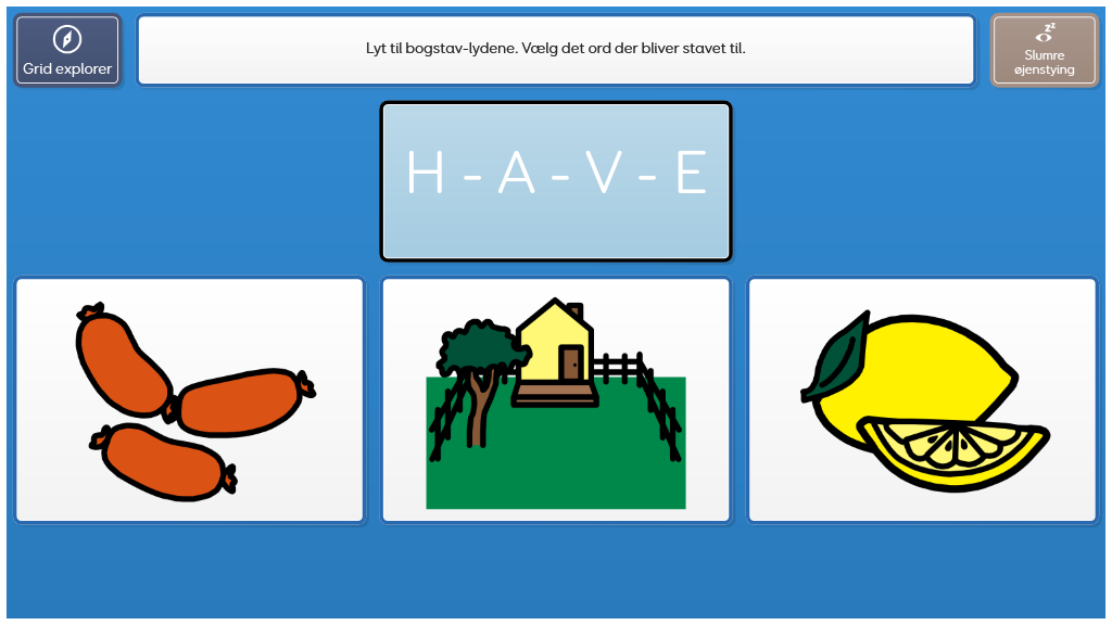 Niveau 2. Længere ord. I dette sidesæt skal du lytte til flere bogstavlyde, og vælge det rette symbol/ord. Tidlig træning af literacy og "afkodning".